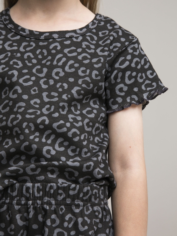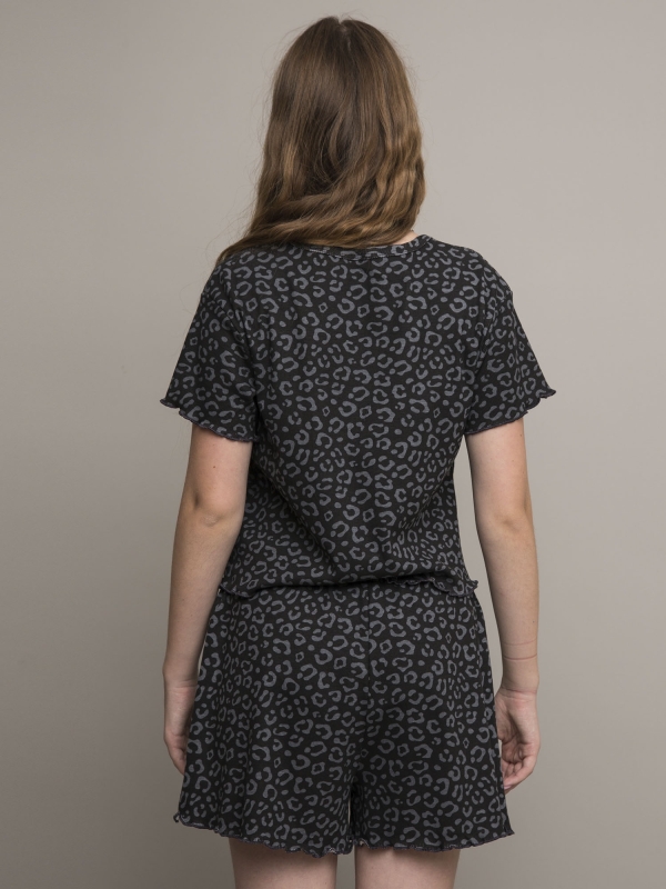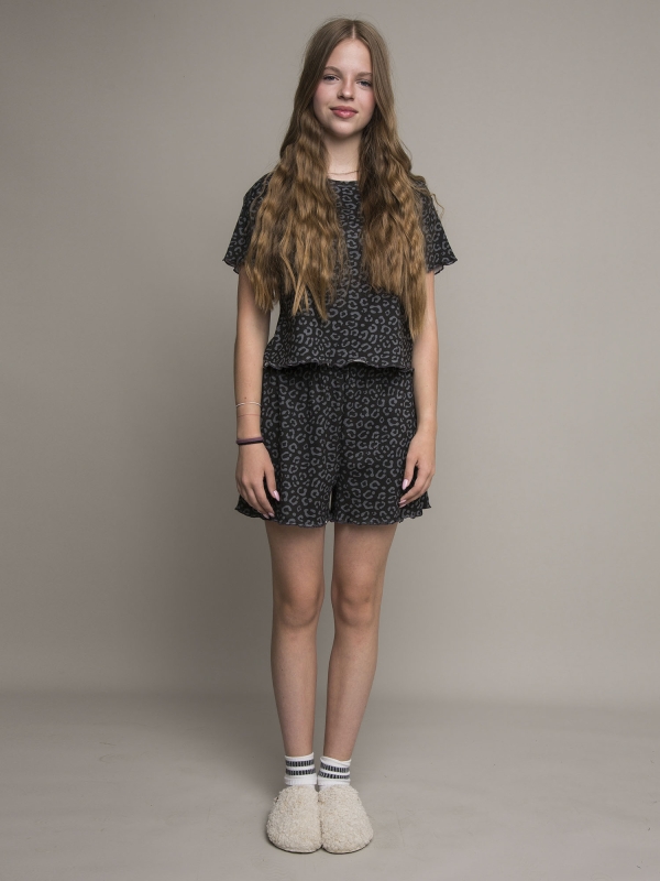 Пижамный комплект для девочки из кашкорсе: футболка + шорты. Модный черный комплект с эффектным леопардовым принтом, выполненный из мягкого кашкорсе (хлопок с небольшим добавлением эластана). Мягкая дышащая ткань с легкой растяжкой, удобная округлая горловина футболки, шорты с широкой эластичной резинкой на талии.