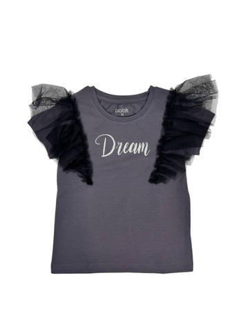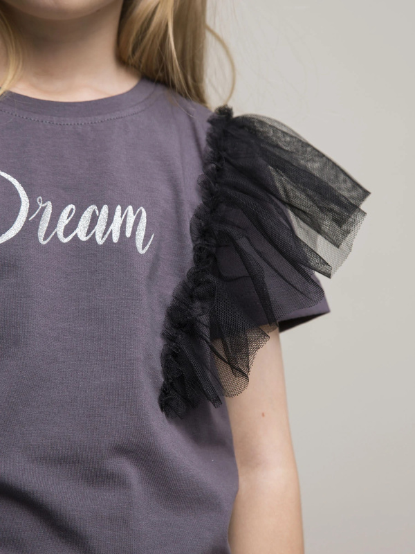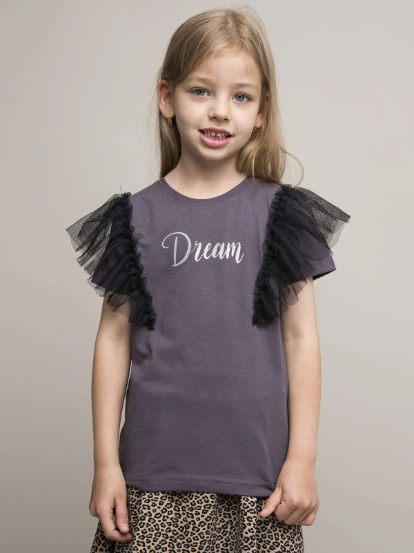 Детская футболка с коротким рукавом в сером цвете с эффектными черными рукавами-крылышками. Стильная и оригинальная футболка для девочек, выполненная из премиального супрема. Модная надпись на груди придает образу индивидуальность. Удобная округлая горловина и свободный крой для комфорта в движении. Натуральный хлопок обеспечивает воздухообмен и комфорт при носке.