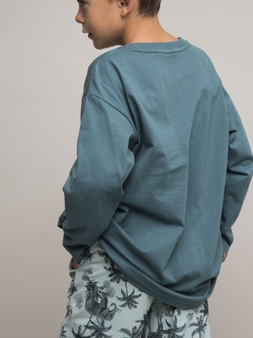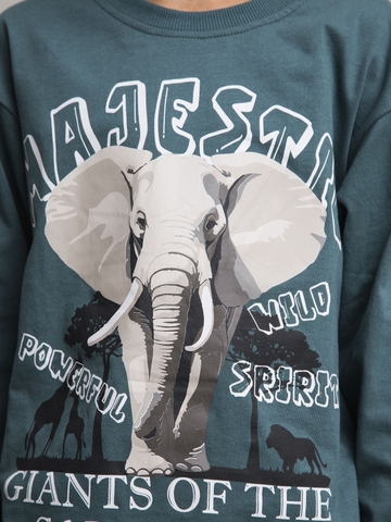 Детский пижамный комплект для мальчика из супрема пенье. Футболка зеленая с длинным рукавом и милым принтом в виде слона и надписями. Брюки со стильным тропическим принтом. Эластичная резинка на брюках для комфортного сна.