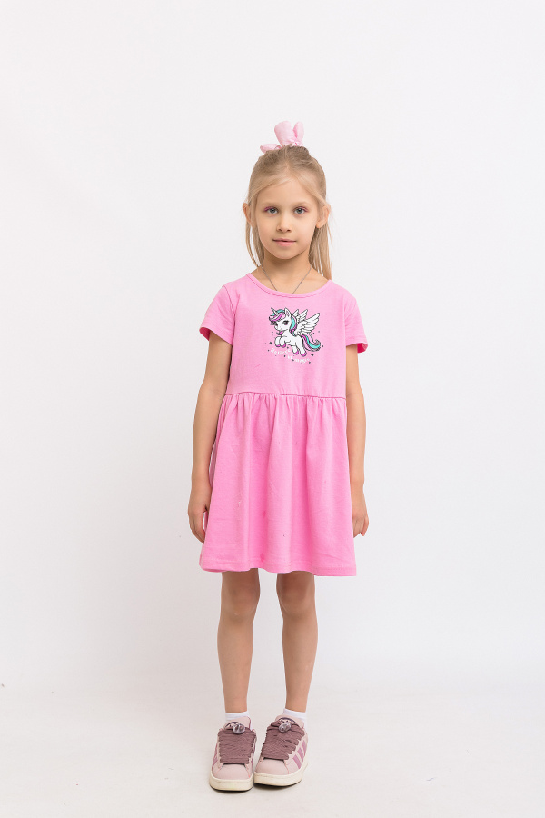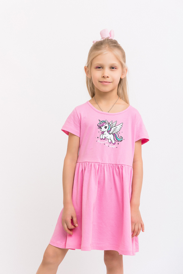 Платье с коротким рукавом розовое для девочки из натурального хлопка. Мягкая, дышащая ткань, нежная к детской коже. Милый принт в виде единорога. Удобная горловина - широкая округлая форма не натирает шею. Нежный розовый цвет - идеальный оттенок для маленьких модниц. Свободный крой для комфорта в течение всего дня. Короткие рукава - идеально для теплой погоды.