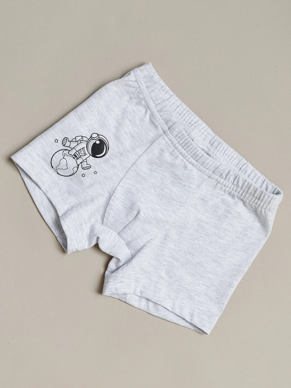 Боксеры (трусы) для мальчика серые с принтом на мягкой резинке. Выполнены из приятного на ощупь, мягкого, плотного хлопчатобумажного материала, который хорошо пропускает воздух и не линяет после многократных стирок. Удобные лекала и анатомический крой отлично сидят на фигуре ребенка и дарят ощущение комфорта в течение всего дня.
