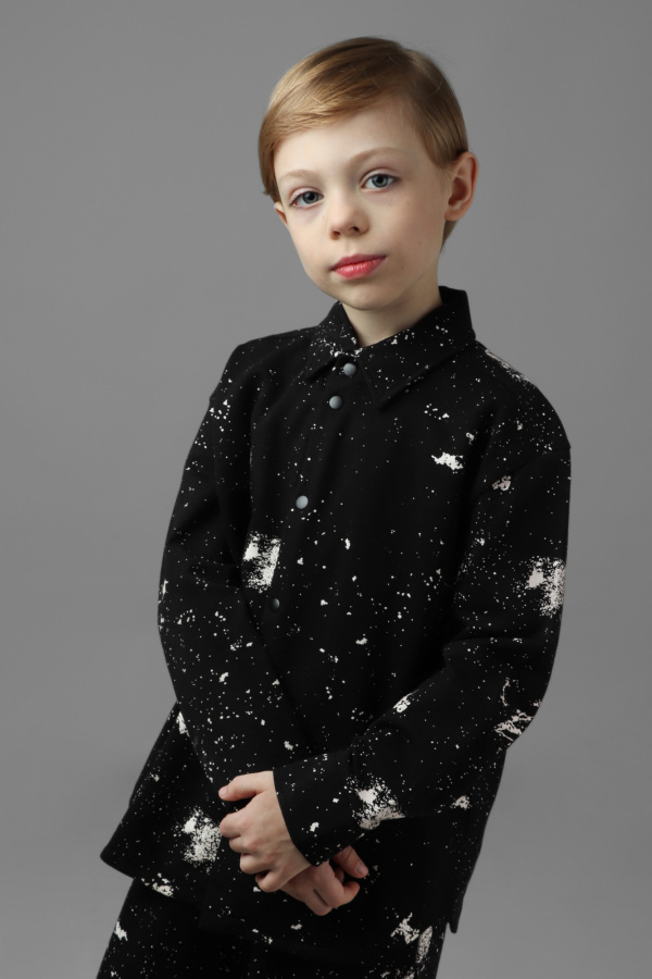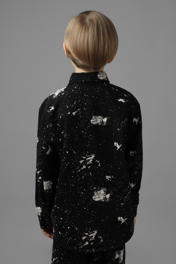 Мальчиковая рубашка из мягкого футера с принтом «в брызгах». Натуральный хлопок в составе обеспечивает комфорт, а эластан — идеальную посадку. Универсальная всесезонная модель.
