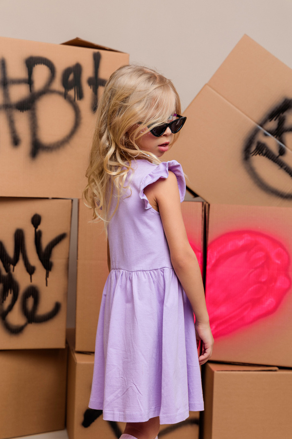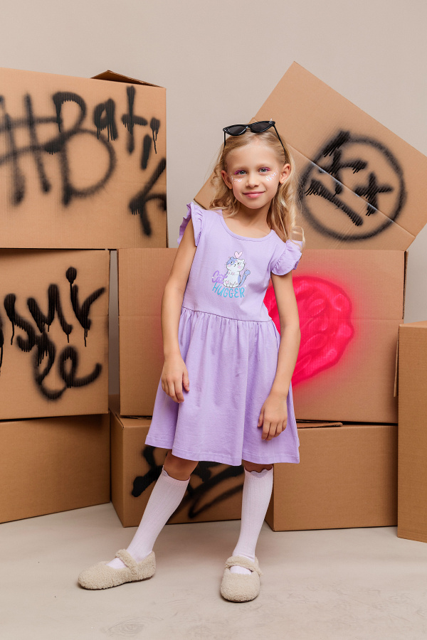 Платье для девочки с коротким рукавом фиолетовое из натурального хлопка. На груди принт в виде котика, круглая горловина. Рукава-крылышки с оборками. Отличный выбор для комфортной повседневной носки летом на прогулку и в любое другое время года в помещении: дома, в садике, в гостях.