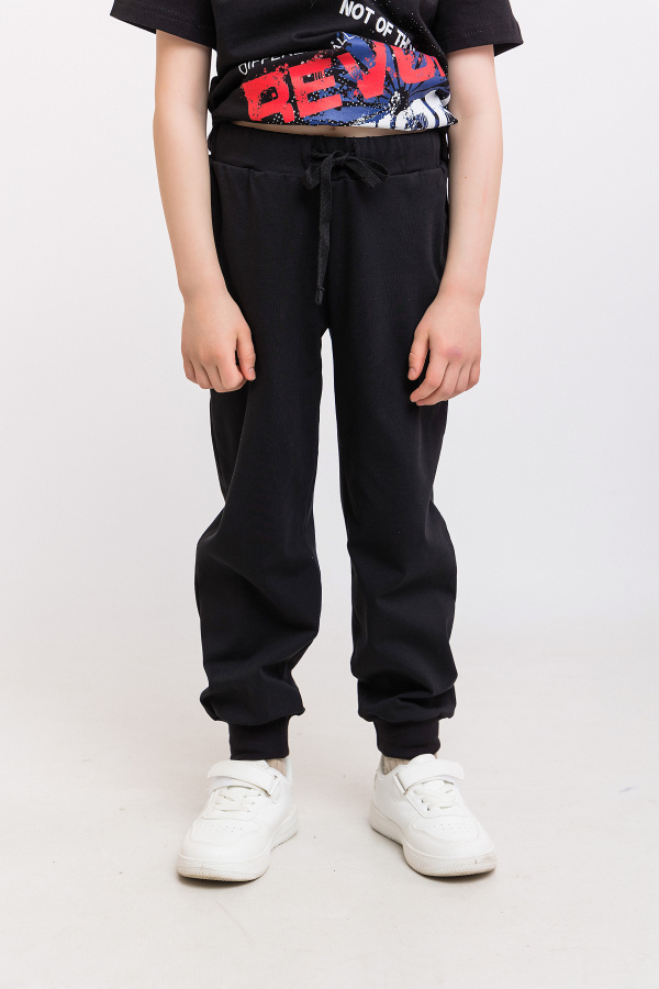 Стильные и практичные брюки для мальчика в спортивном дизайне. Удобный крой – свободный силуэт не сковывает движения. Практичный черный цвет сочетается с любой одеждой. Регулируемый пояс на резинке со шнурком. Практичные манжеты – низ штанин на резинке для удобства. Подходит для школы, прогулок и активных игр.