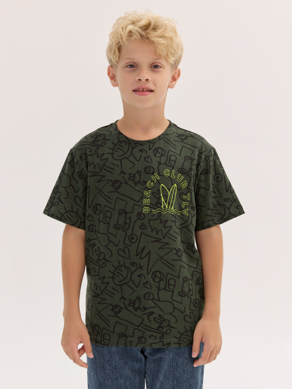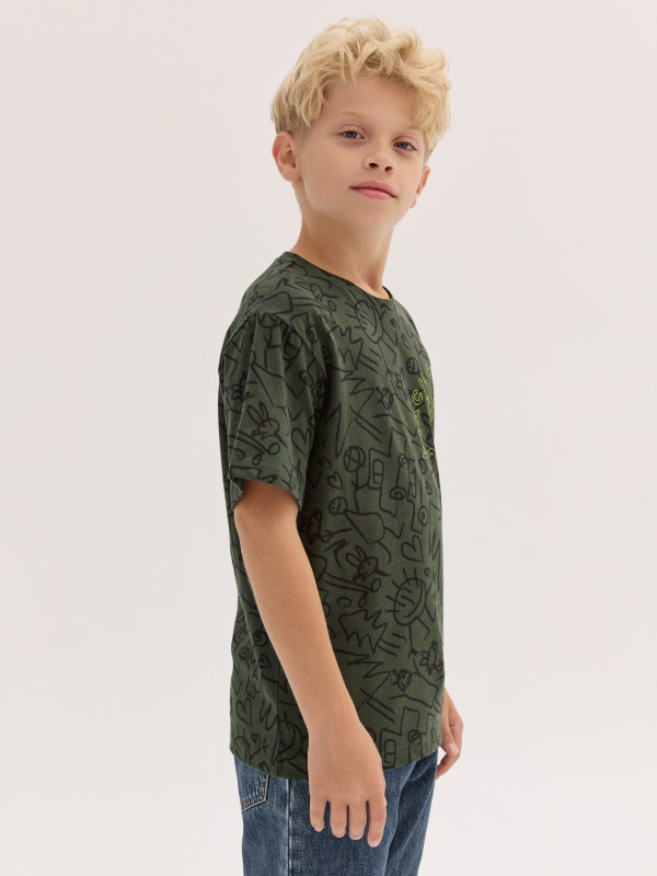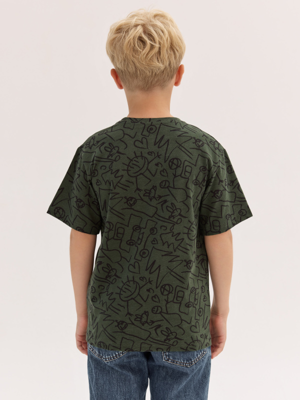 Футболка для мальчика: классического покроя из набивной кулирной глади. Рукав втачной, горловина обработана притачной бейкой из рибаны с лайкрой. Перед декорирован принтом.