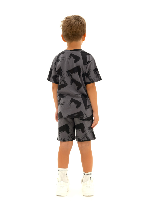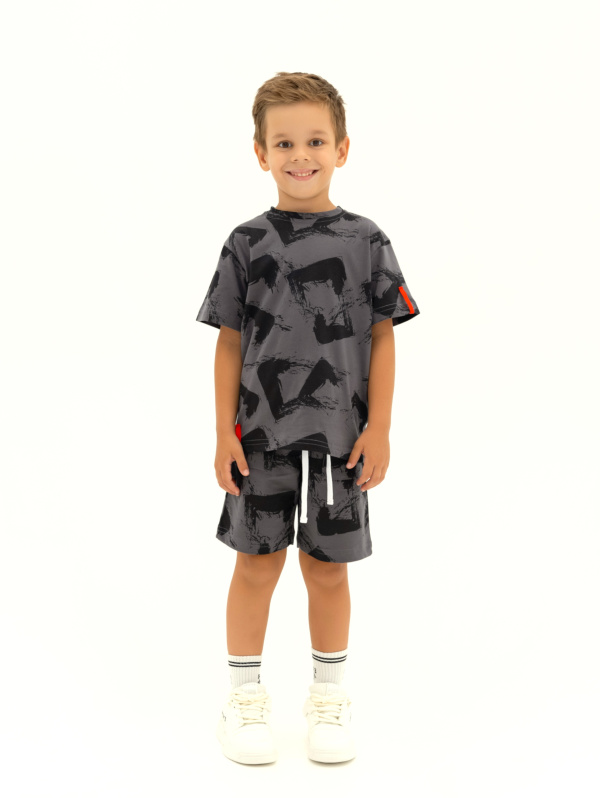 Футболка для мальчика: Футболка с коротким рукавом из набивного полотна. Вырез горловины круглый, обработан притачной бейкой из рибаны с лайкрой. На рукаве и по низу изделия нашиты декоративные флажки.