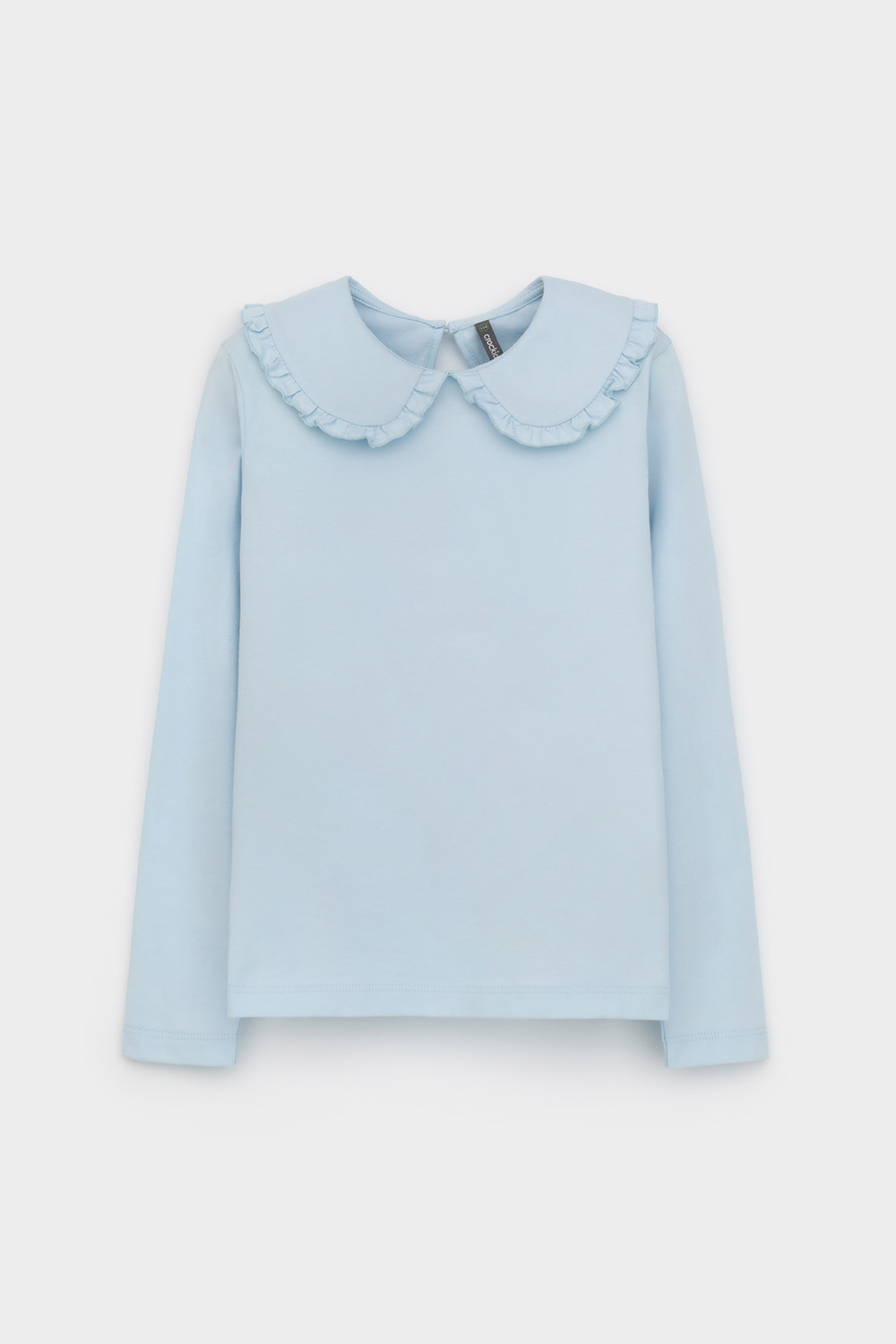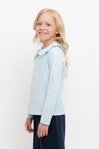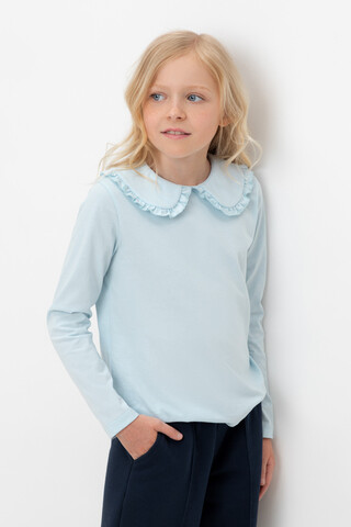 Блузка школьная для девочки с отложным воротником из трикотажа супрем. Застёгивается на пуговицу и петельку из шляпной резины. Воротник украшен оборкой. Рукава и низ изделия обработаны плоскими швами.