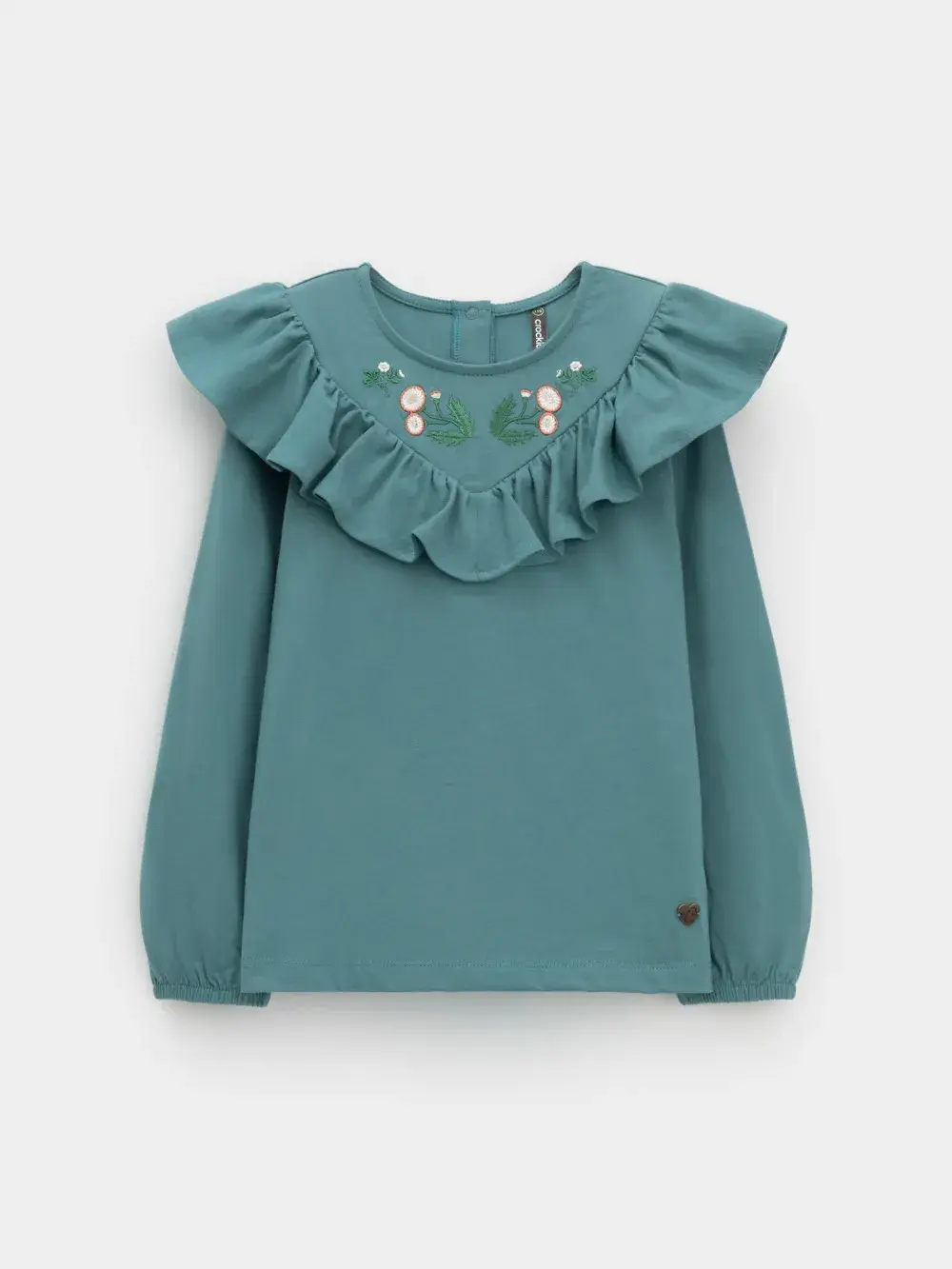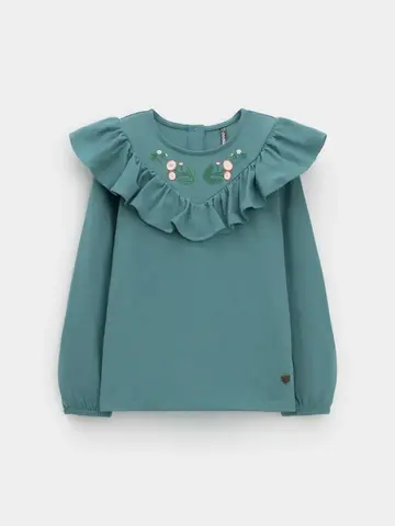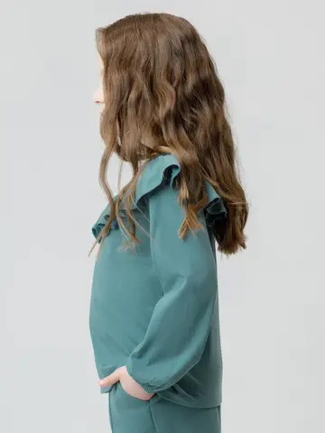 Блузка с воланом для девочки. Изготовлена из высококачественного трикотажного полотна и украшена вышивкой на груди. Блузка сохраняет форму и стойкий цвет после многочисленных стирок и идеально подходит на каждый день. Все трикотажные полотна производятся в соответствии с нормами швейцарского сертификата ЭкоТекс.