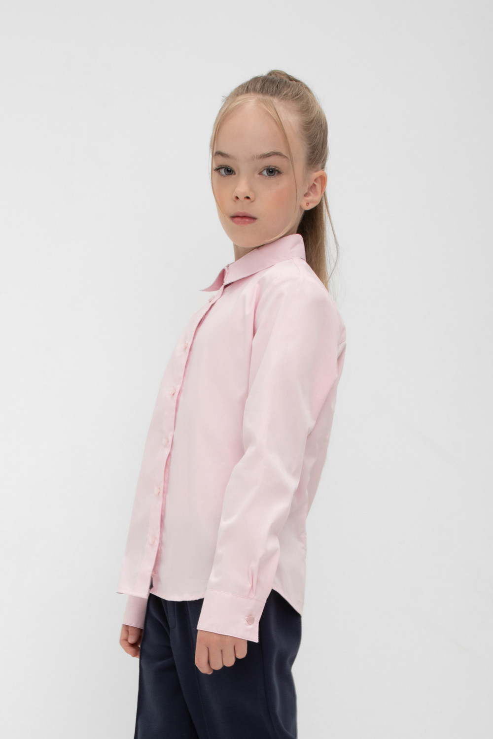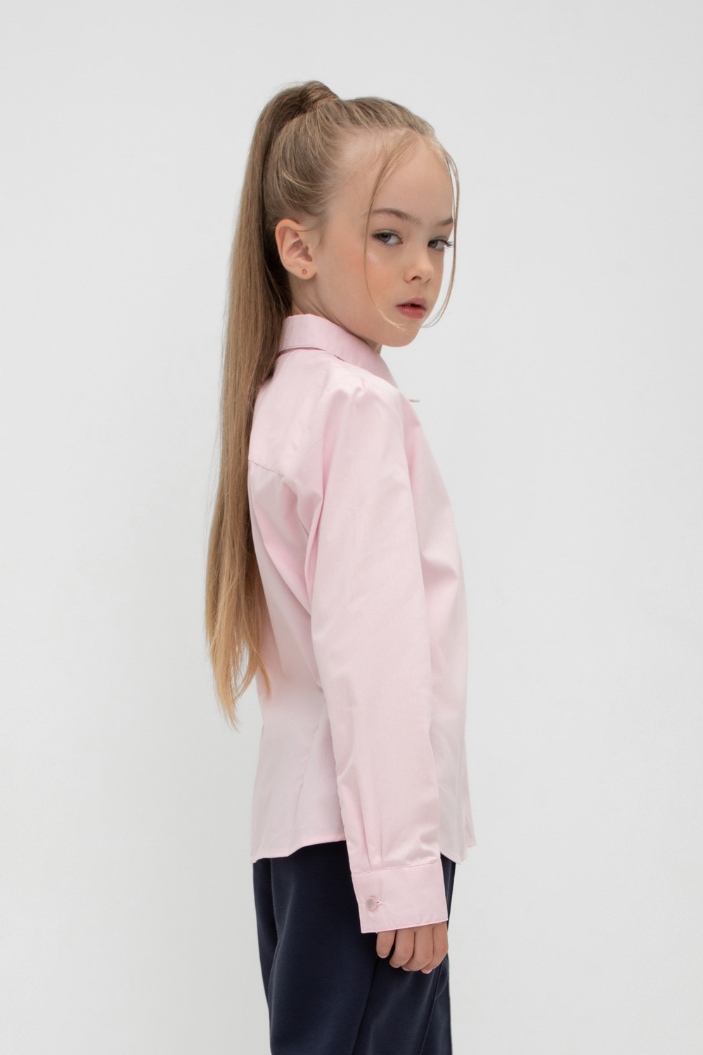 Классическая блузка для девочки с отложным воротником. Застегивается спереди на планку с пуговицами. Длинные втачанные рукава с манжетами регулируются по ширине.