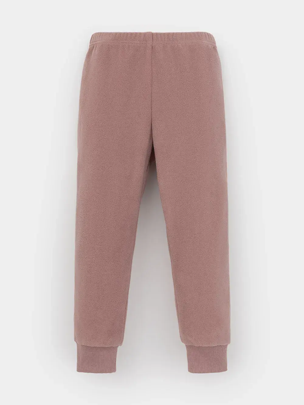 Однотонные детские брюки из флиса с поясом на резинке. Низ изделия на манжетах из эластичного трикотажа в рубчик. Брюки сохраняют цвет и форму после многократных стирок.