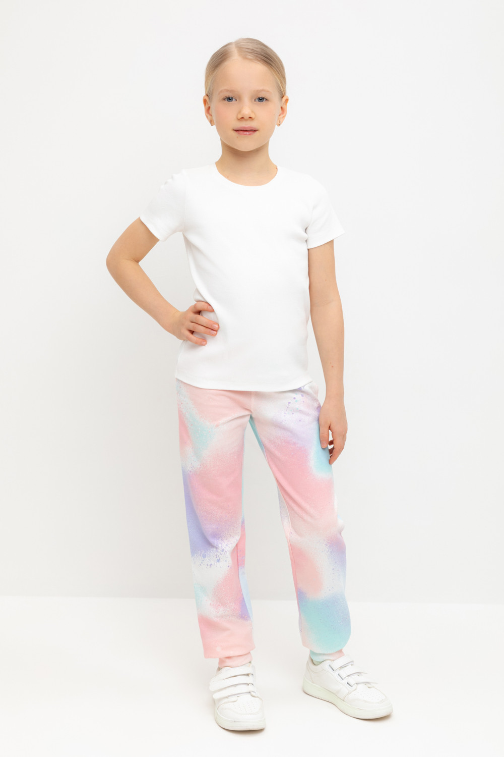 Трикотажные брюки для девочки из мягкого петельчатого футера. Эластичный пояс на резинке, по бокам два удобных кармана, внизу эластичные манжеты.