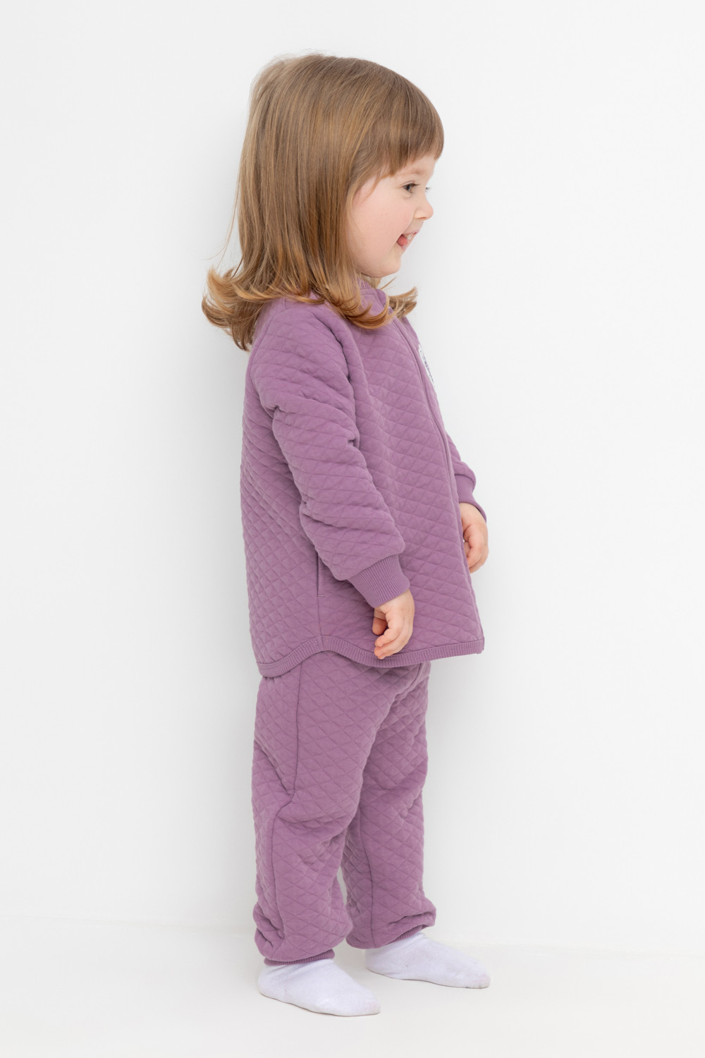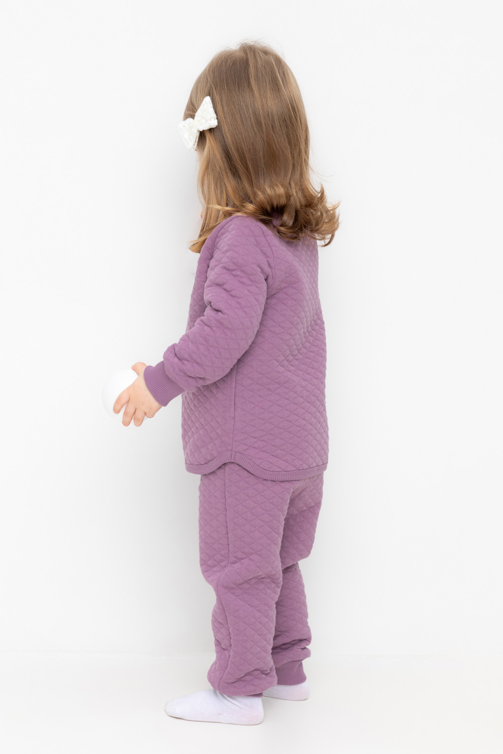 Трикотажные брюки для девочки из стеганого трикотажного полотна. Эластичный пояс на резинке регулируется по ширине с помощью шнурка, внизу манжеты на резинке.