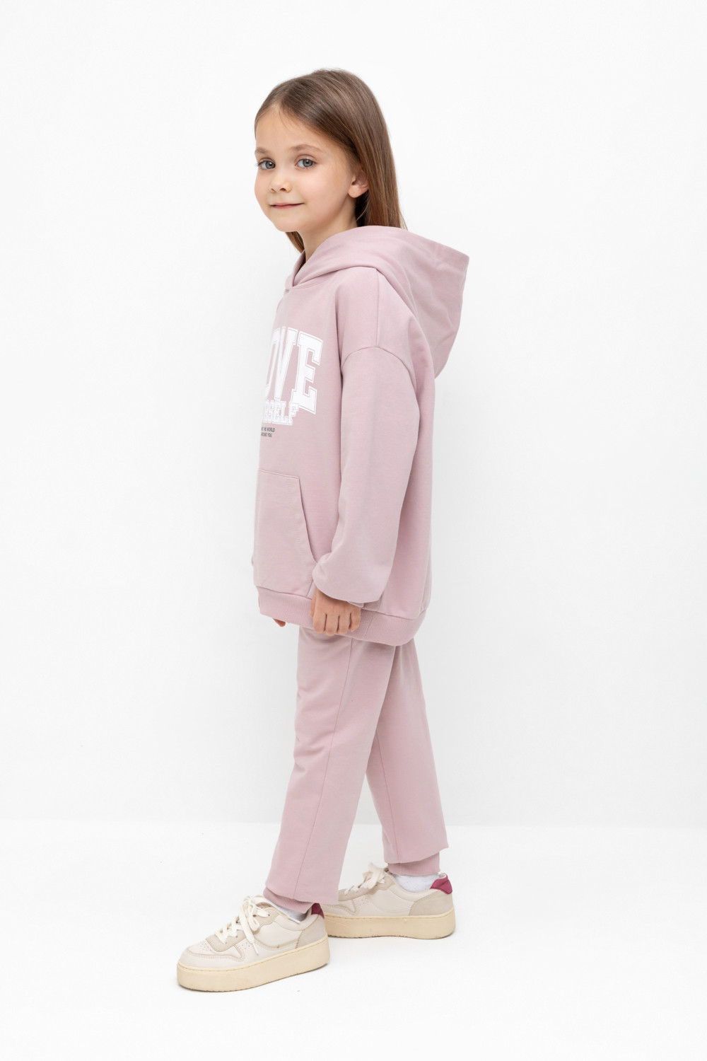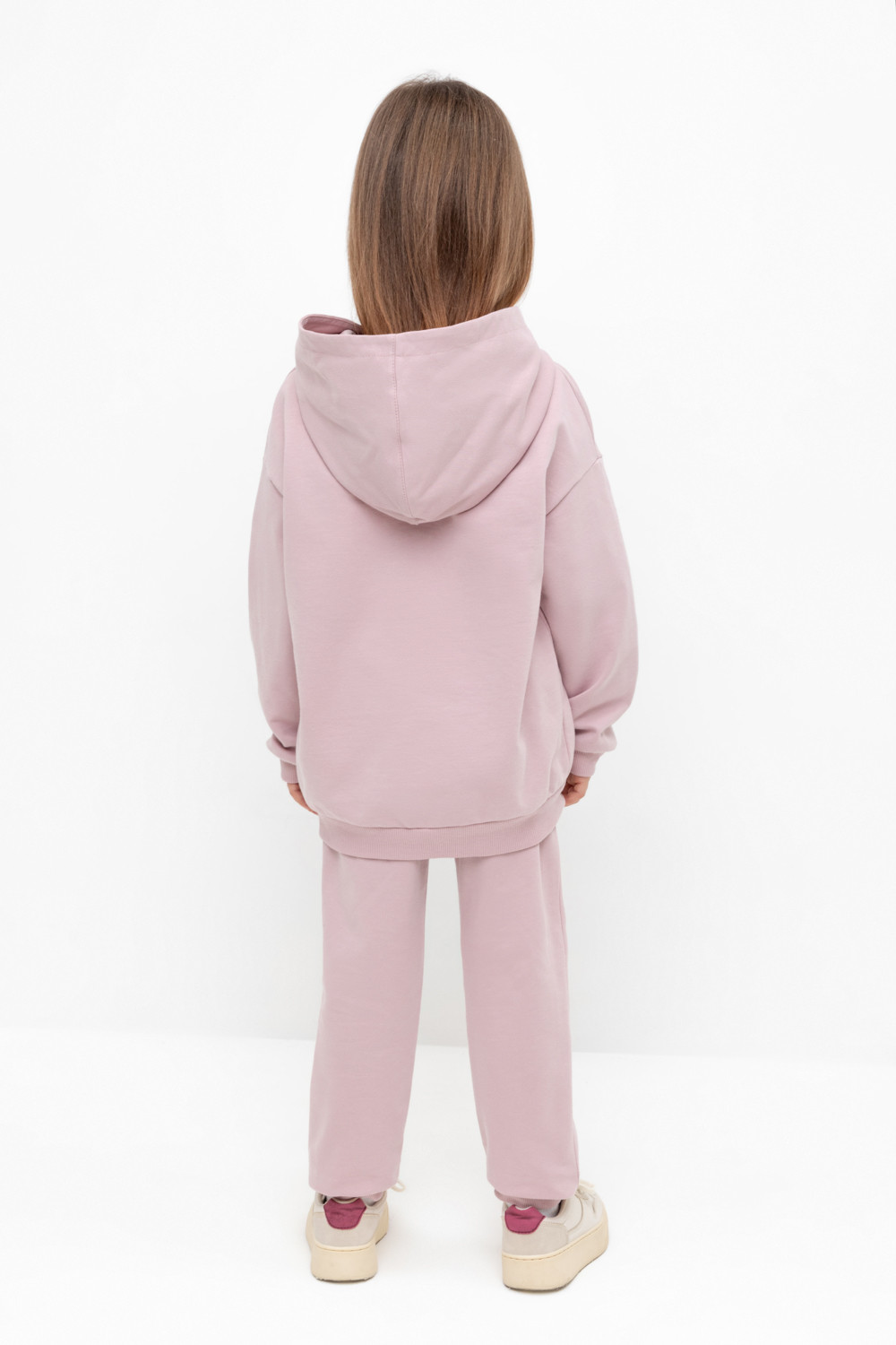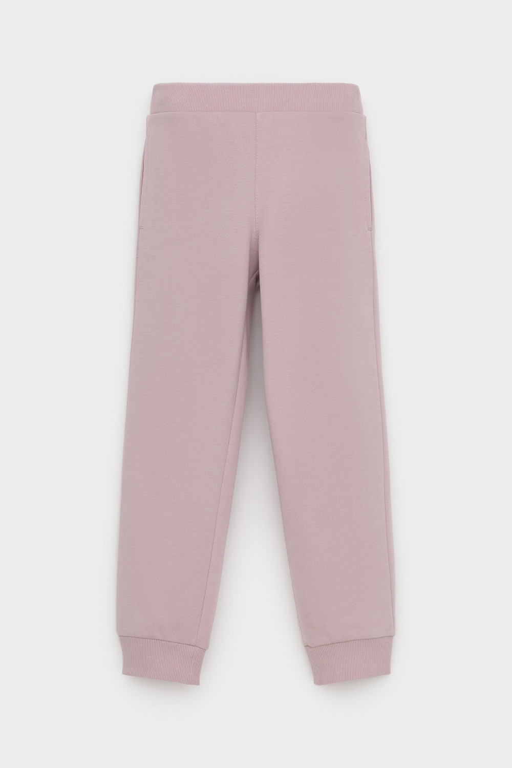 Трикотажные брюки для девочки из мягкого петельчатого футера. Эластичный пояс на резинке, по бокам два удобных кармана, внизу эластичные манжеты.