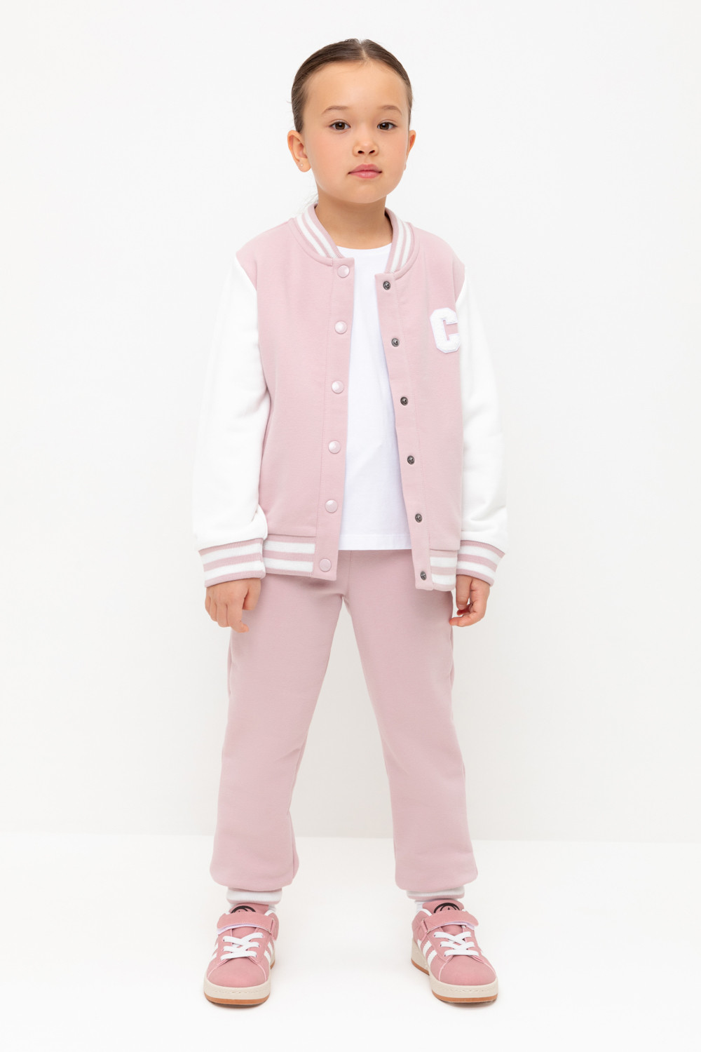Брюки для девочки из мягкого петельчатого трикотажа. В составе 80% натурального хлопка и 20% полиэстера, при этом полиэстер ввязан внутрь по особой технологии и не соприкасается с кожей. Эластичный пояс на резинке регулируется по ширине с помощью шнурка, по бокам два удобных кармана, внизу эластичные манжеты.