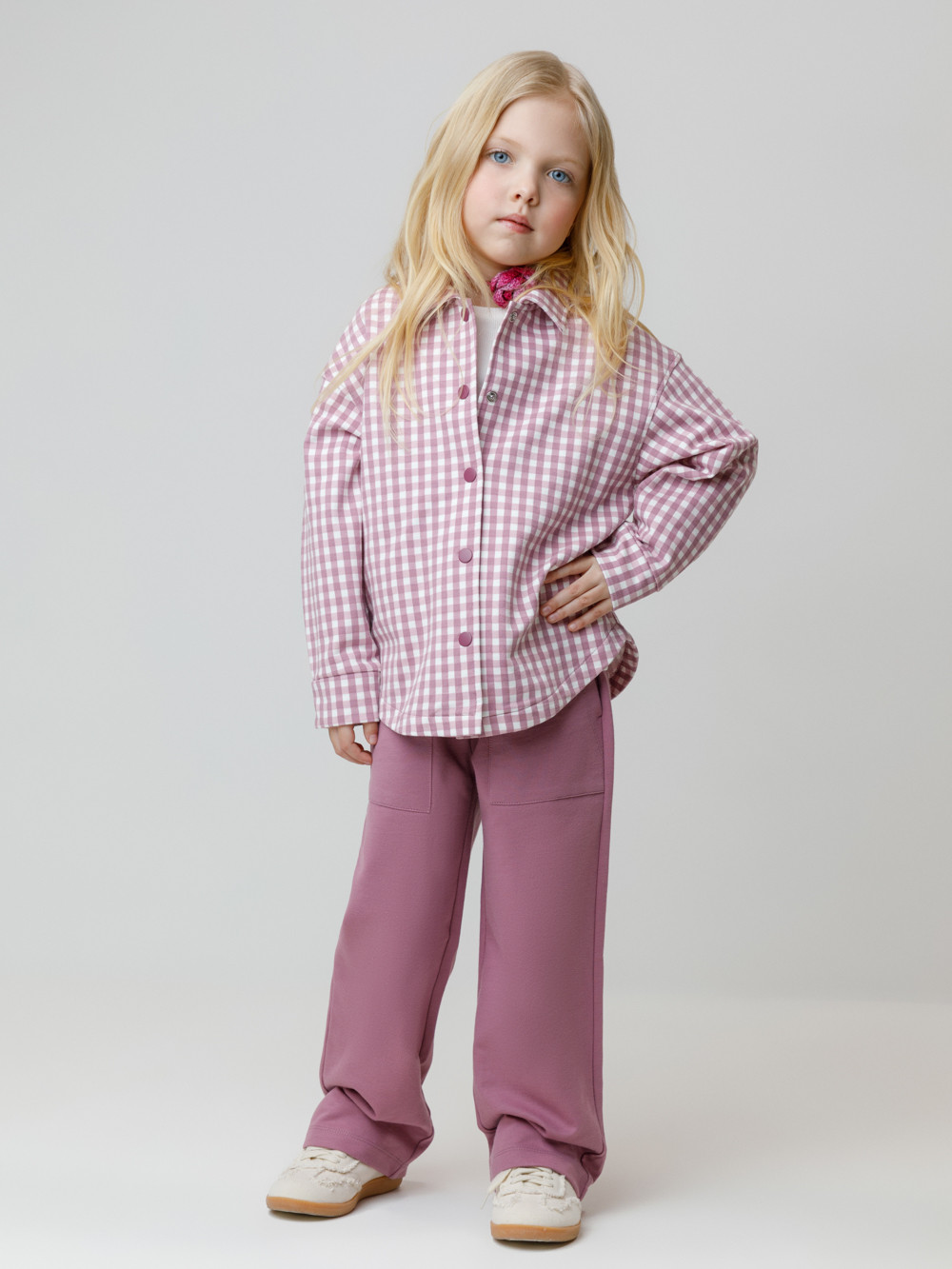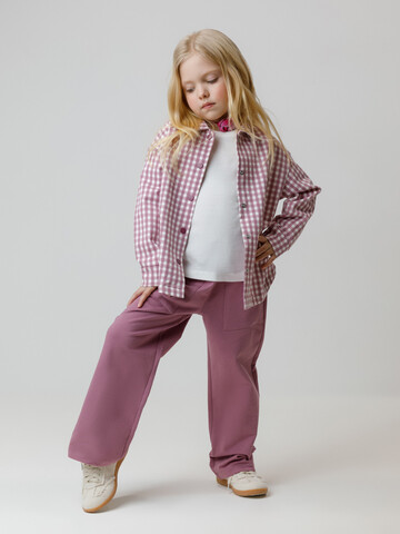 Прямые брюки для девочки из мягкого петельчатого трикотажа. Эластичный пояс на резинке регулируется по ширине с помощью шнурка. По бокам два удобных накладных кармана. Изделие сохраняет цвет и форму после многократных стирок. Все трикотажные полотна производятся в соответствии с нормами швейцарского сертификата ЭкоТекс.