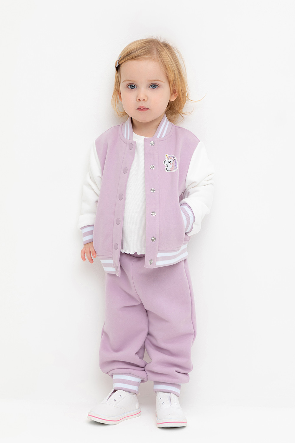 Брюки для девочки из мягкого петельчатого трикотажа. В составе 80% натурального хлопка и 20% полиэстера, при этом полиэстер ввязан внутрь по особой технологии и не соприкасается с кожей. Эластичный пояс на резинке регулируется по ширине с помощью шнурка, внизу эластичные манжеты.