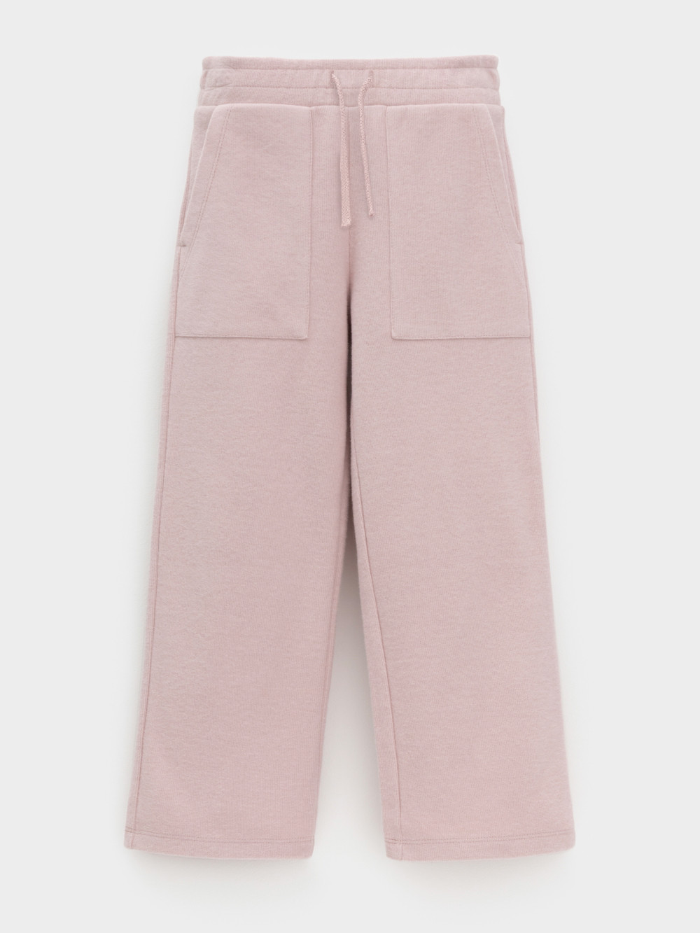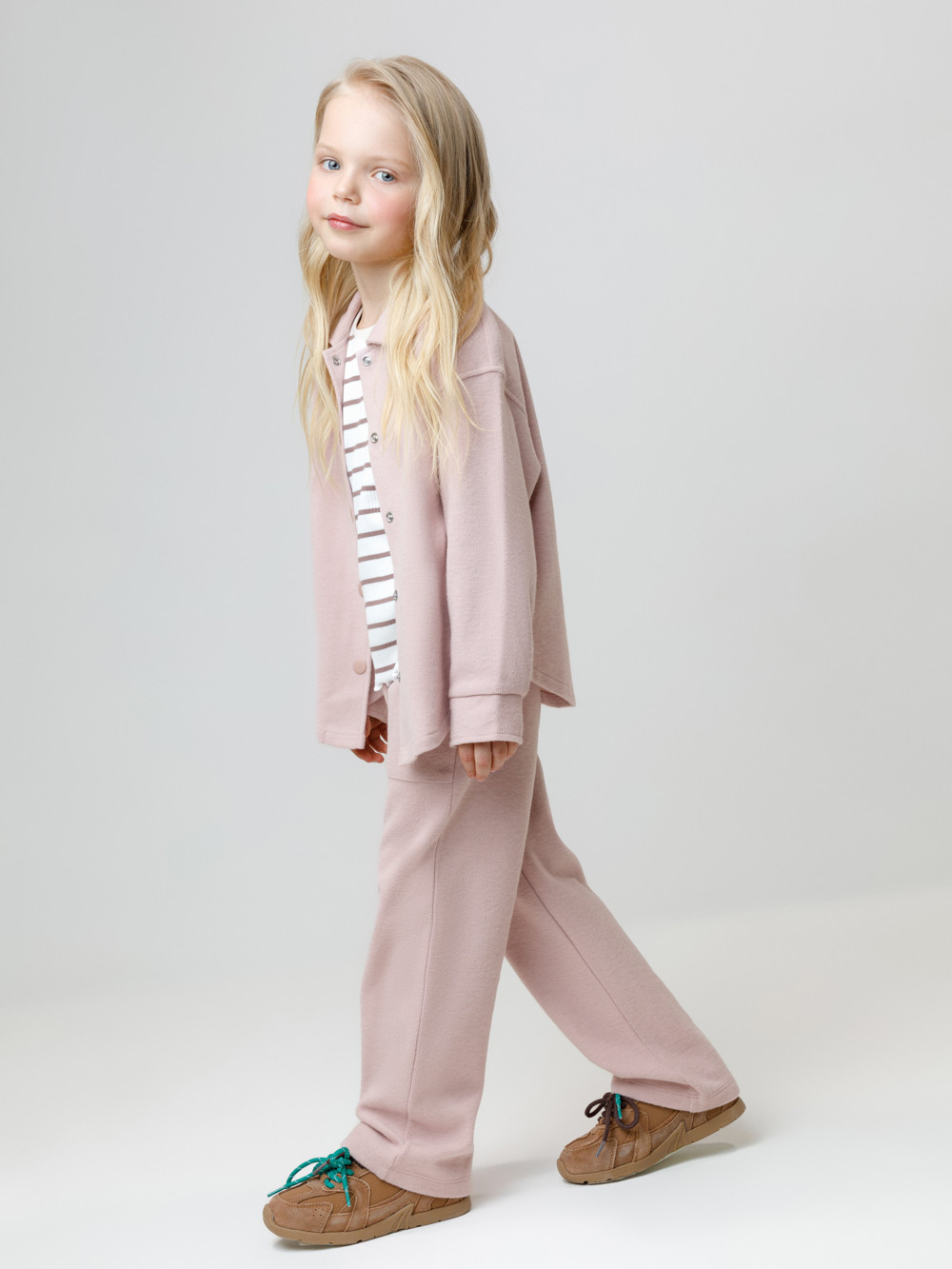 Прямые брюки для девочки из мягкого трикотажа селаник с peach эффектом. Peach эффект достигается с помощью технологии обработки полотна, при которой на его поверхности создаётся лёгкий ворс, напоминающий нежную текстуру кожи персика. Эластичный пояс на резинке регулируется по ширине с помощью шнурка. По бокам два удобных накладных кармана. Изделие сохраняет цвет и форму после многократных стирок. Все трикотажные полотна производятся в соответствии с нормами швейцарского сертификата ЭкоТекс.