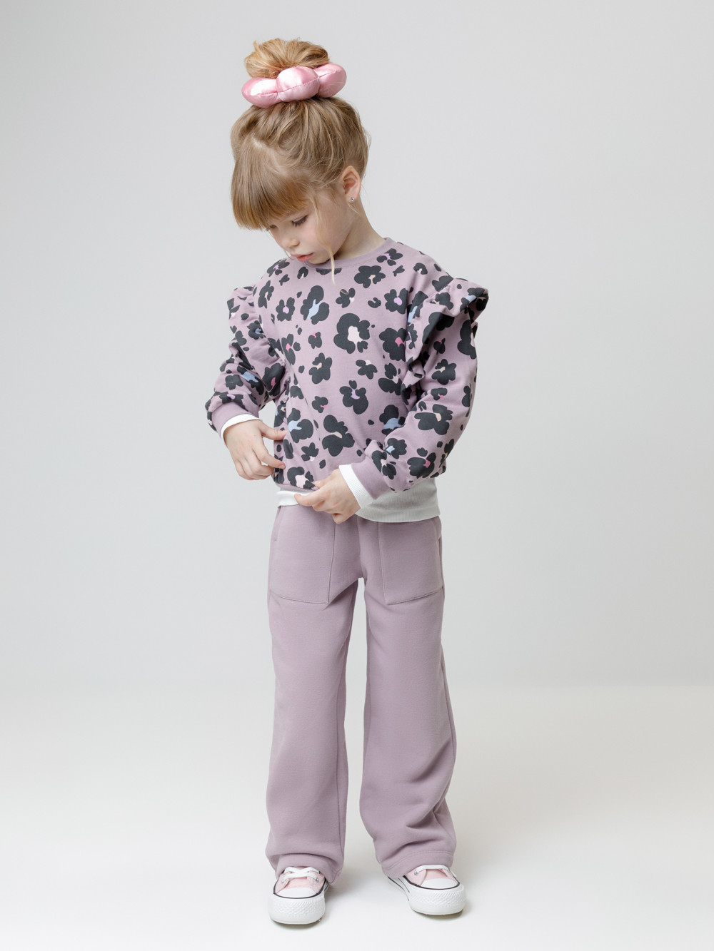 Прямые брюки для девочки из мягкого трикотажа с начёсом. Эластичный пояс на резинке регулируется по ширине с помощью шнурка. По бокам два удобных накладных кармана. Изделие сохраняет цвет и форму после многократных стирок. Все трикотажные полотна производятся в соответствии с нормами швейцарского сертификата ЭкоТекс.
