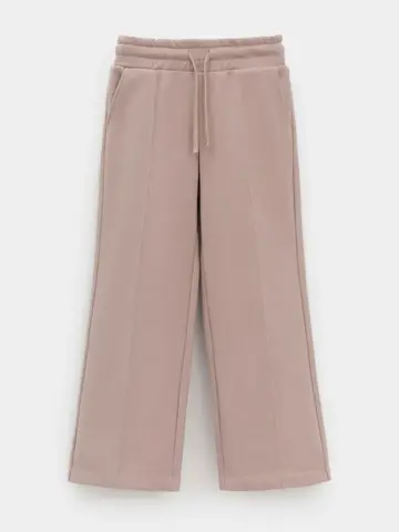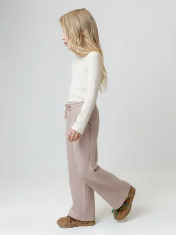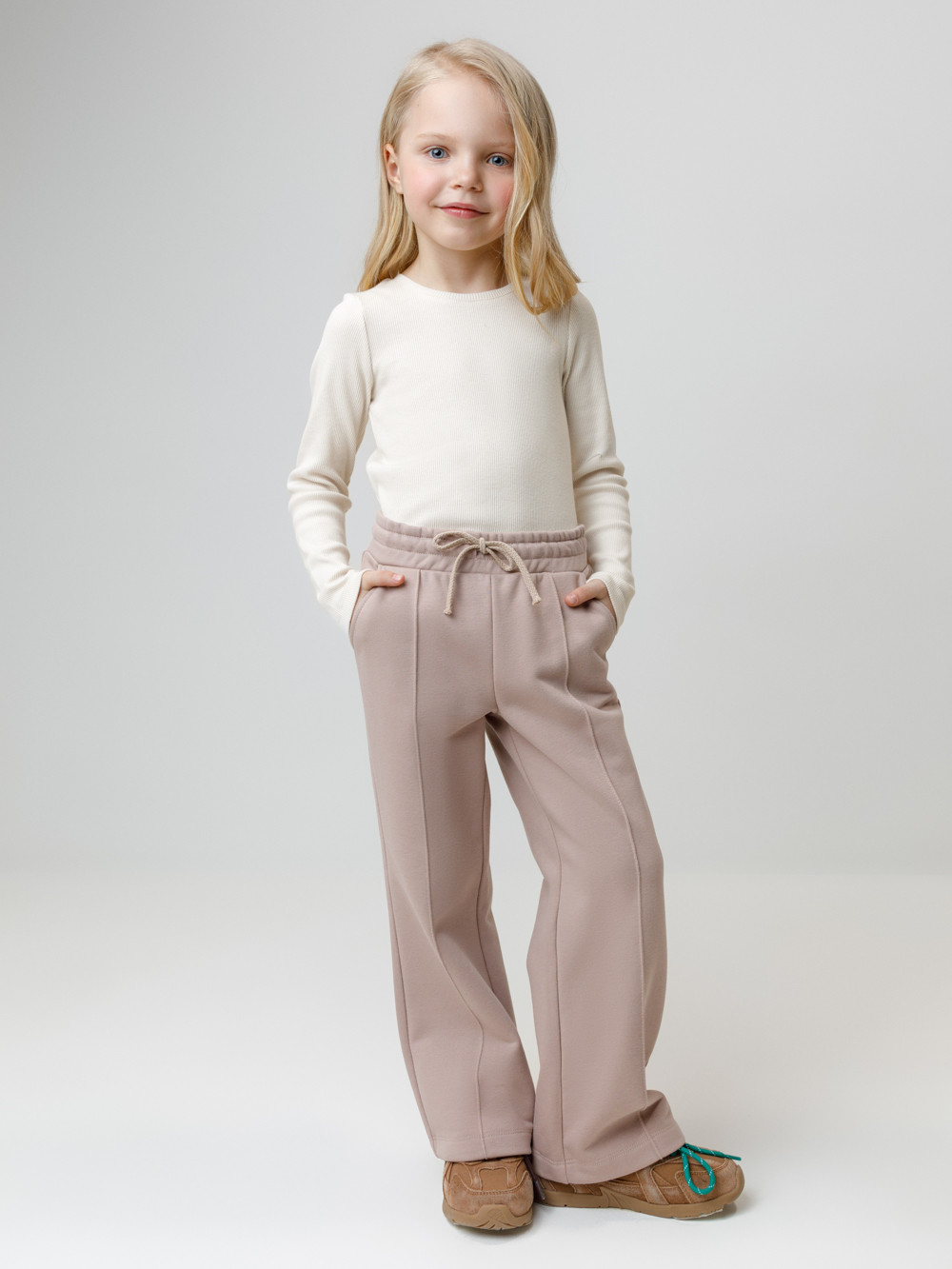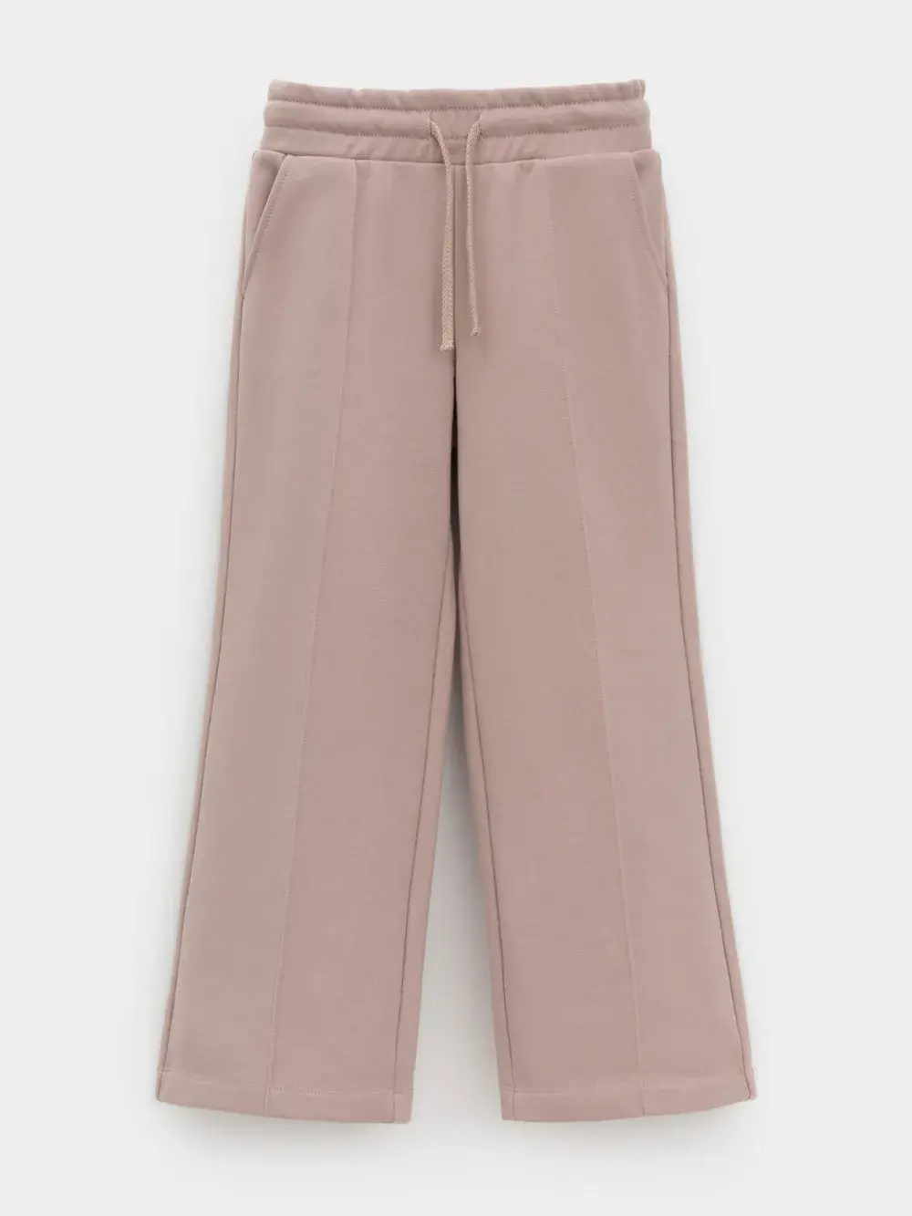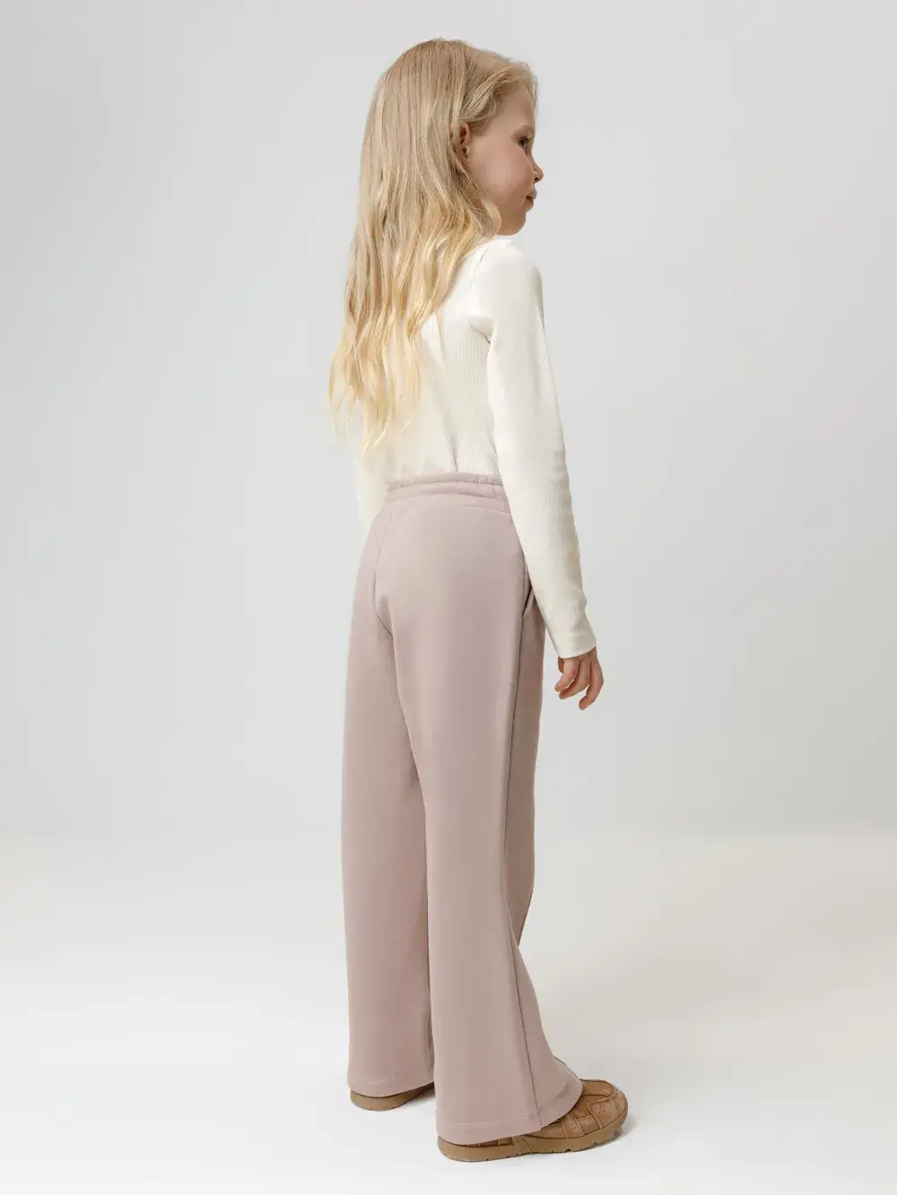 Прямые брюки со стрелками для девочки из мягкого петельчатого трикотажа. Эластичный пояс на резинке регулируется по ширине с помощью шнурка. По бокам два удобных кармана. Спереди застроченные стрелки. Изделие сохраняет цвет и форму после многократных стирок. Все трикотажные полотна производятся в соответствии с нормами швейцарского сертификата ЭкоТекс.
