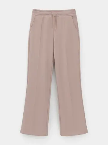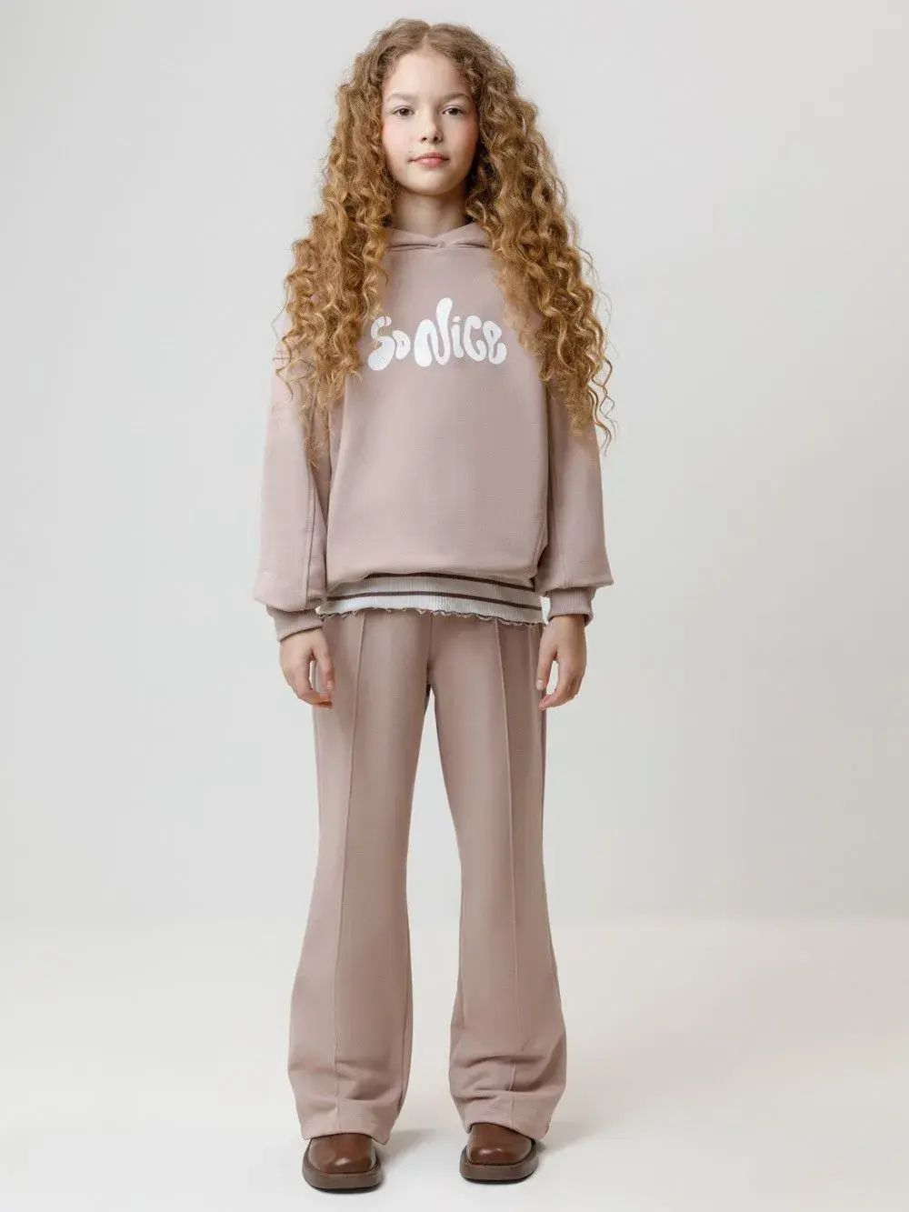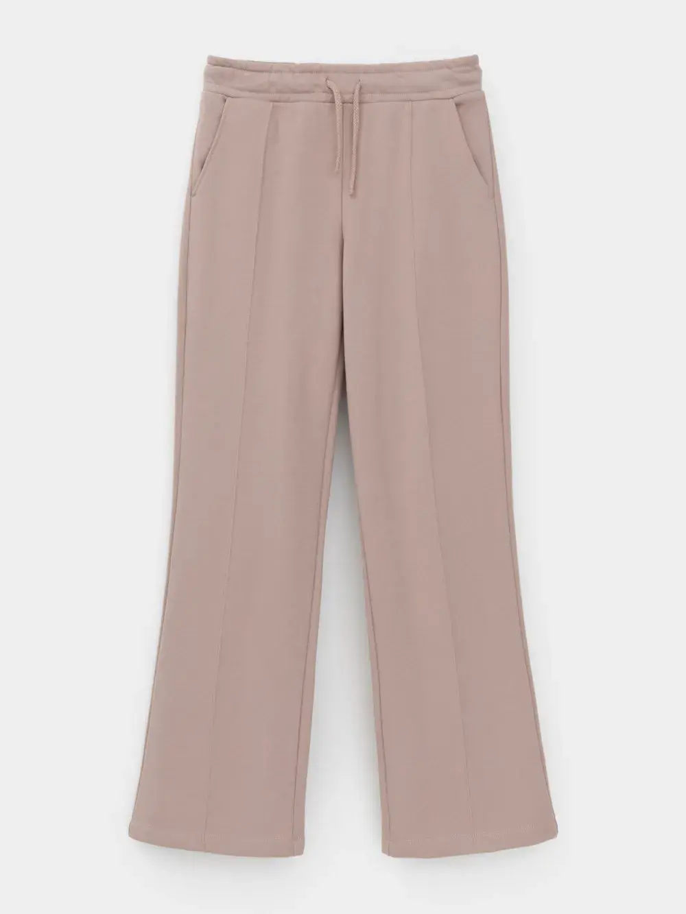 Прямые брюки со стрелками для девочки из мягкого петельчатого трикотажа. Эластичный пояс на резинке регулируется по ширине с помощью шнурка. По бокам два удобных кармана. Спереди застроченные стрелки. Изделие сохраняет цвет и форму после многократных стирок. Все трикотажные полотна производятся в соответствии с нормами швейцарского сертификата ЭкоТекс.
