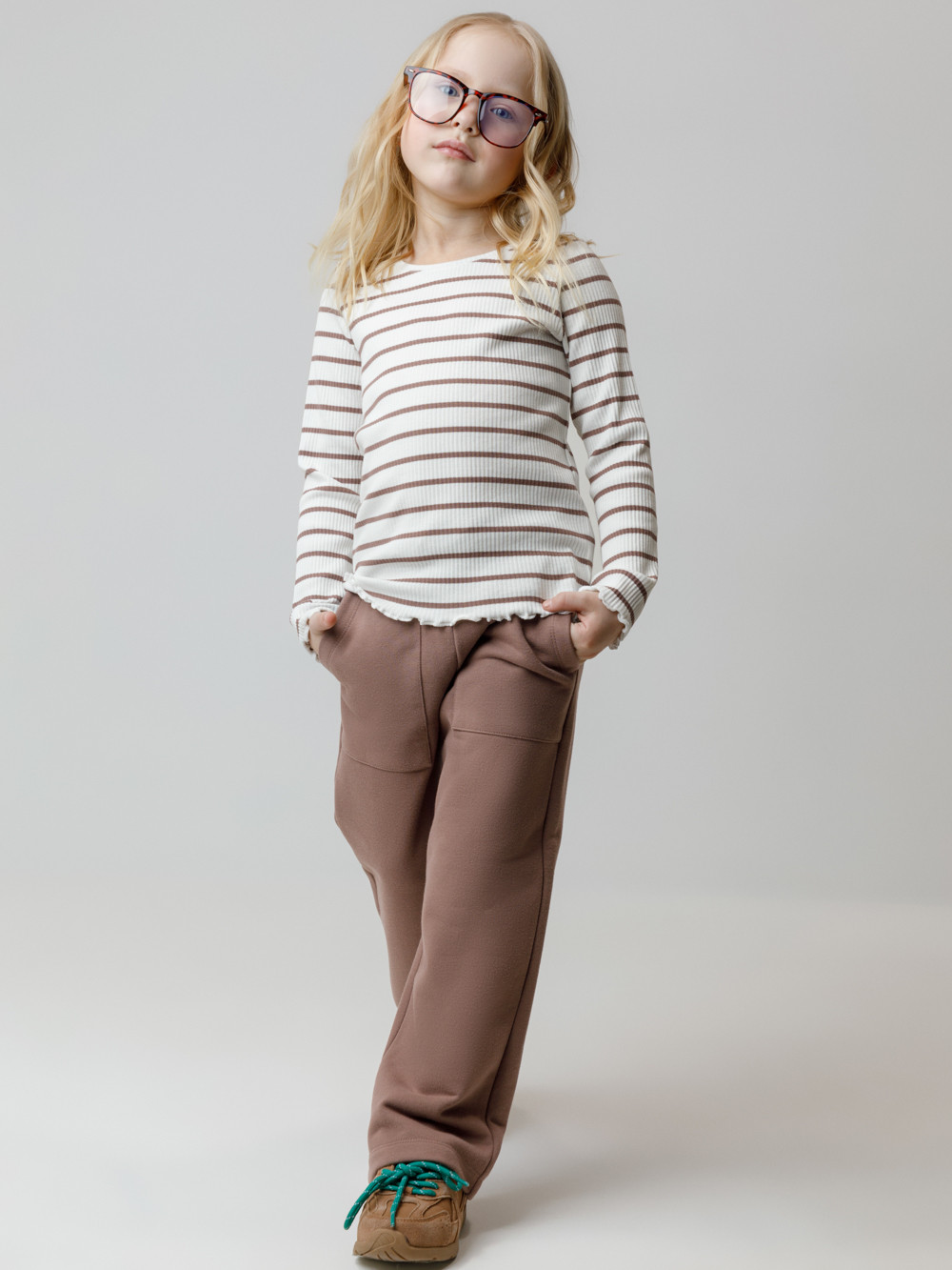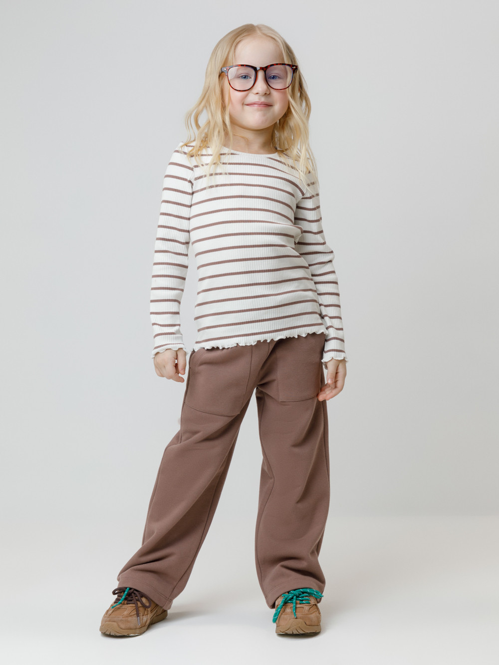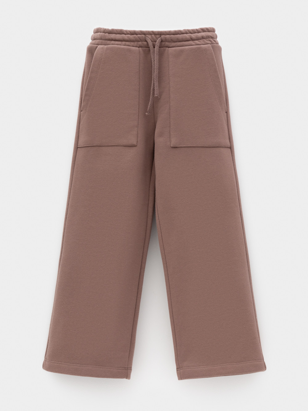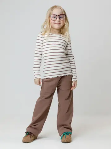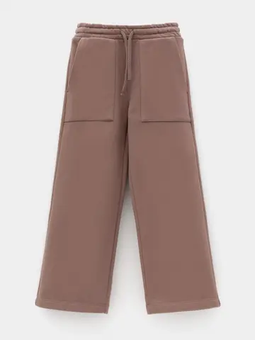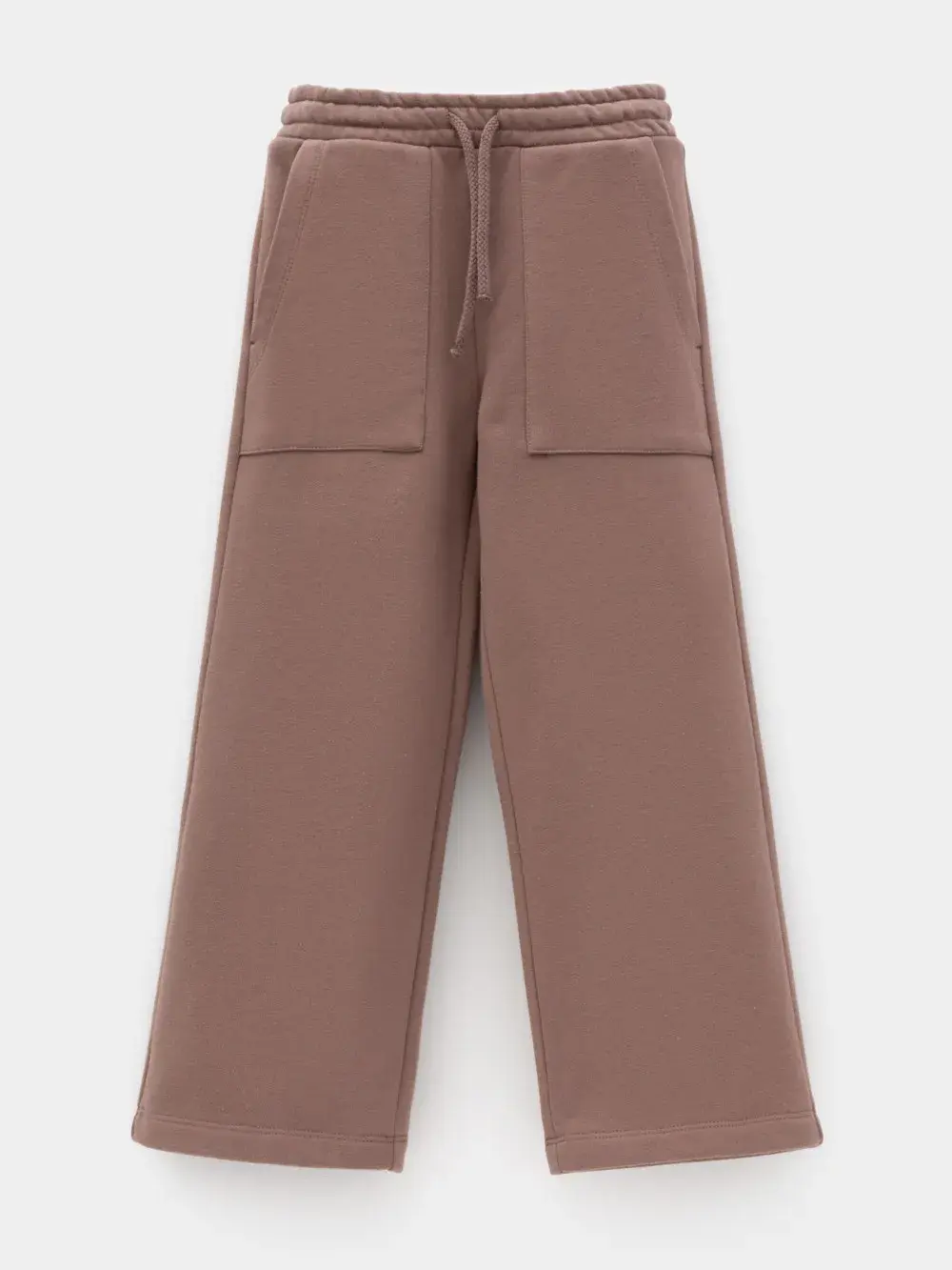 Прямые брюки для девочки из мягкого петельчатого трикотажа. Эластичный пояс на резинке регулируется по ширине с помощью шнурка. По бокам два удобных накладных кармана. Изделие сохраняет цвет и форму после многократных стирок. Все трикотажные полотна производятся в соответствии с нормами швейцарского сертификата ЭкоТекс.