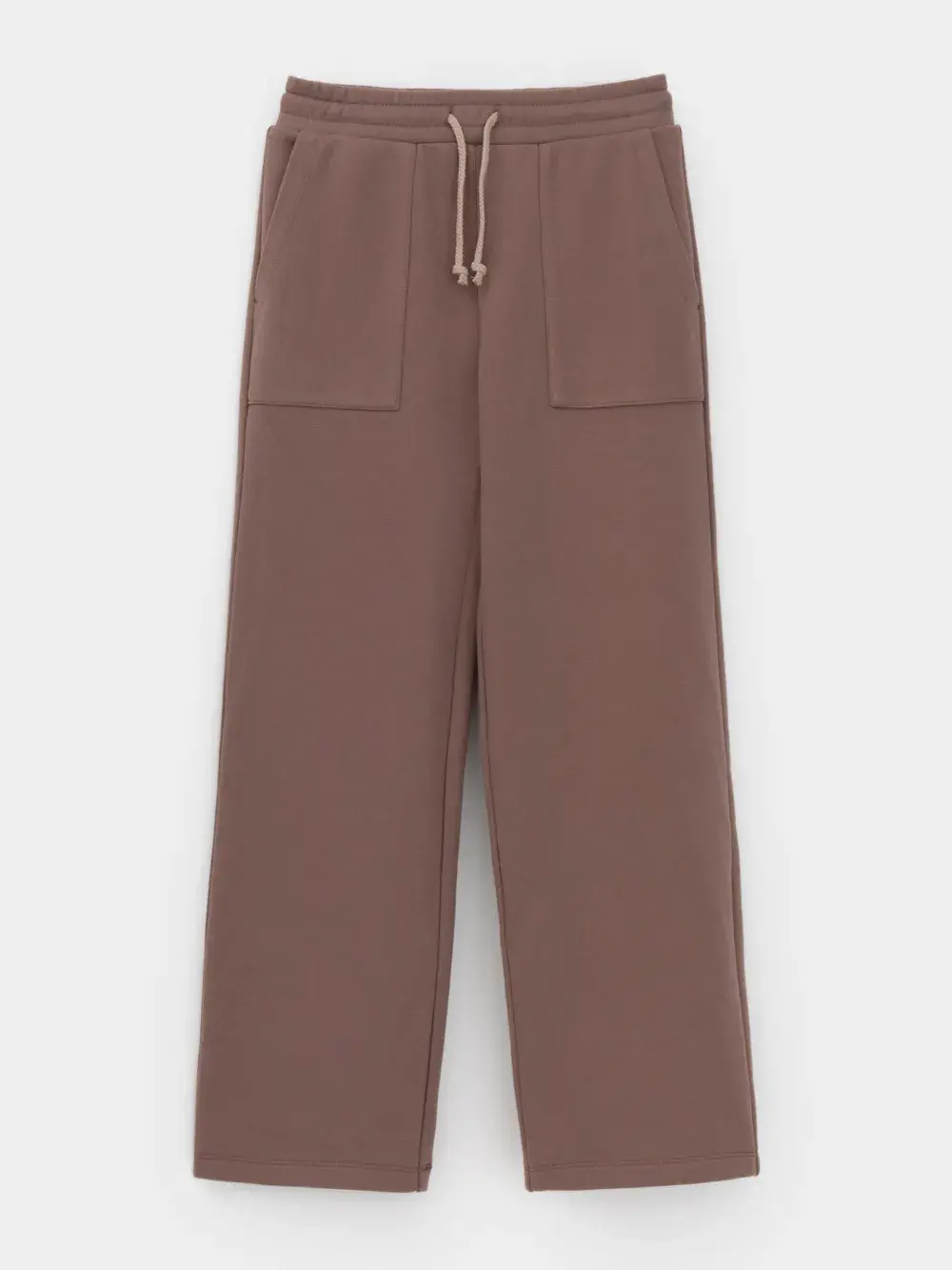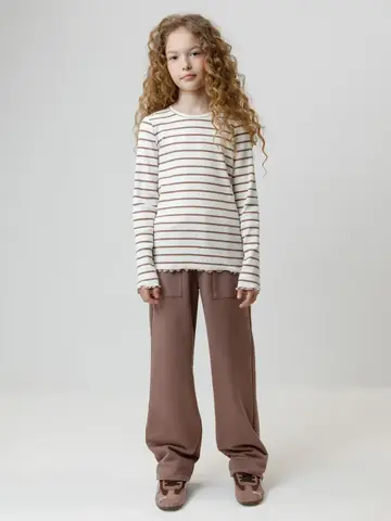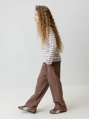 Прямые брюки для девочки из мягкого петельчатого трикотажа. Эластичный пояс на резинке регулируется по ширине с помощью шнурка. По бокам два удобных накладных кармана. Изделие сохраняет цвет и форму после многократных стирок. Все трикотажные полотна производятся в соответствии с нормами швейцарского сертификата ЭкоТекс.