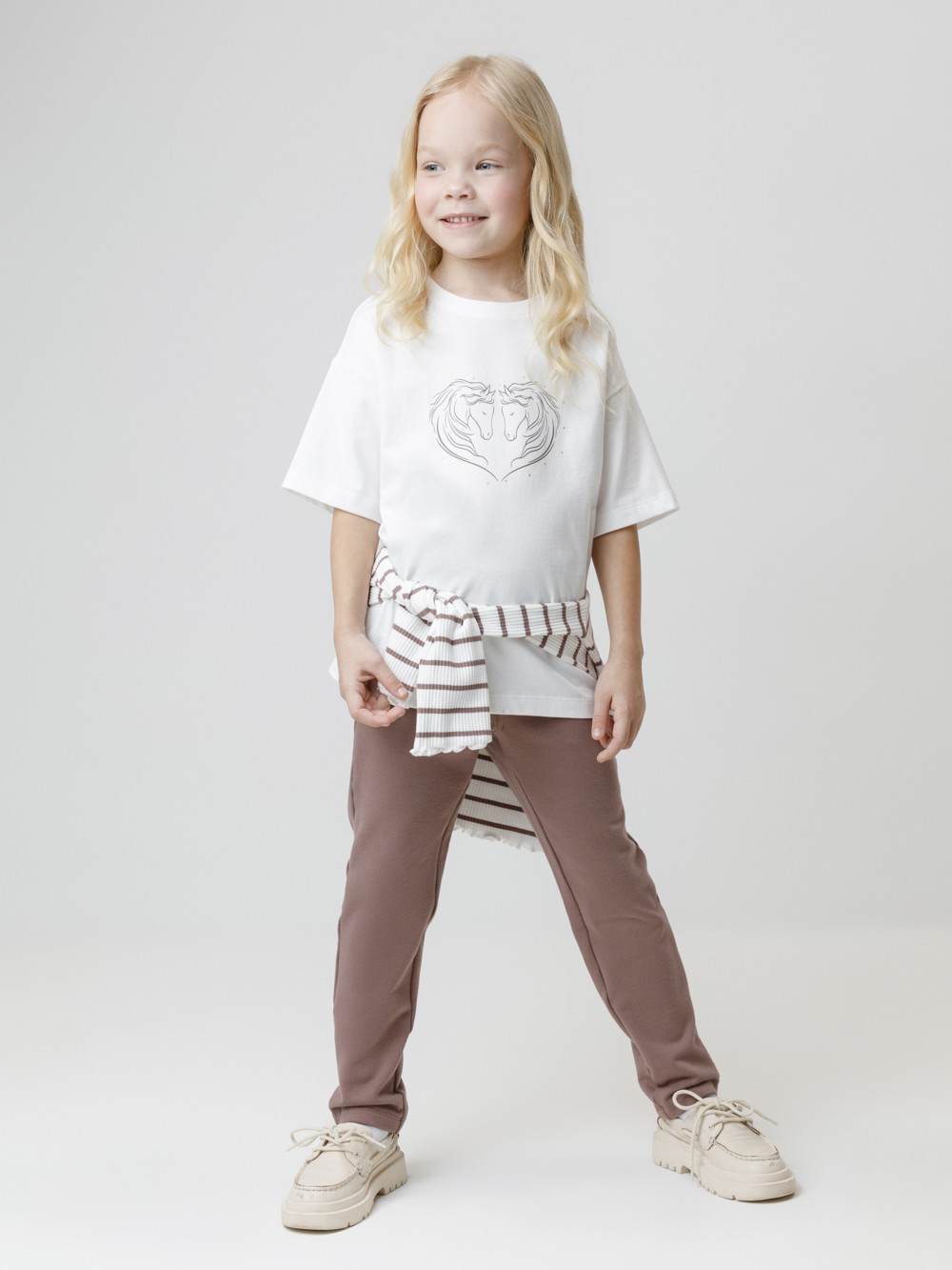 Брюки с имитацией карманов и гульфика для девочки. Изготовлены из мягкого эластичного футера. Пояс на резинке. Изделие сохраняет форму и стойкий цвет после многочисленных стирок и идеально подходит на каждый день. Все трикотажные полотна производятся в соответствии с нормами швейцарского сертификата ЭкоТекс.