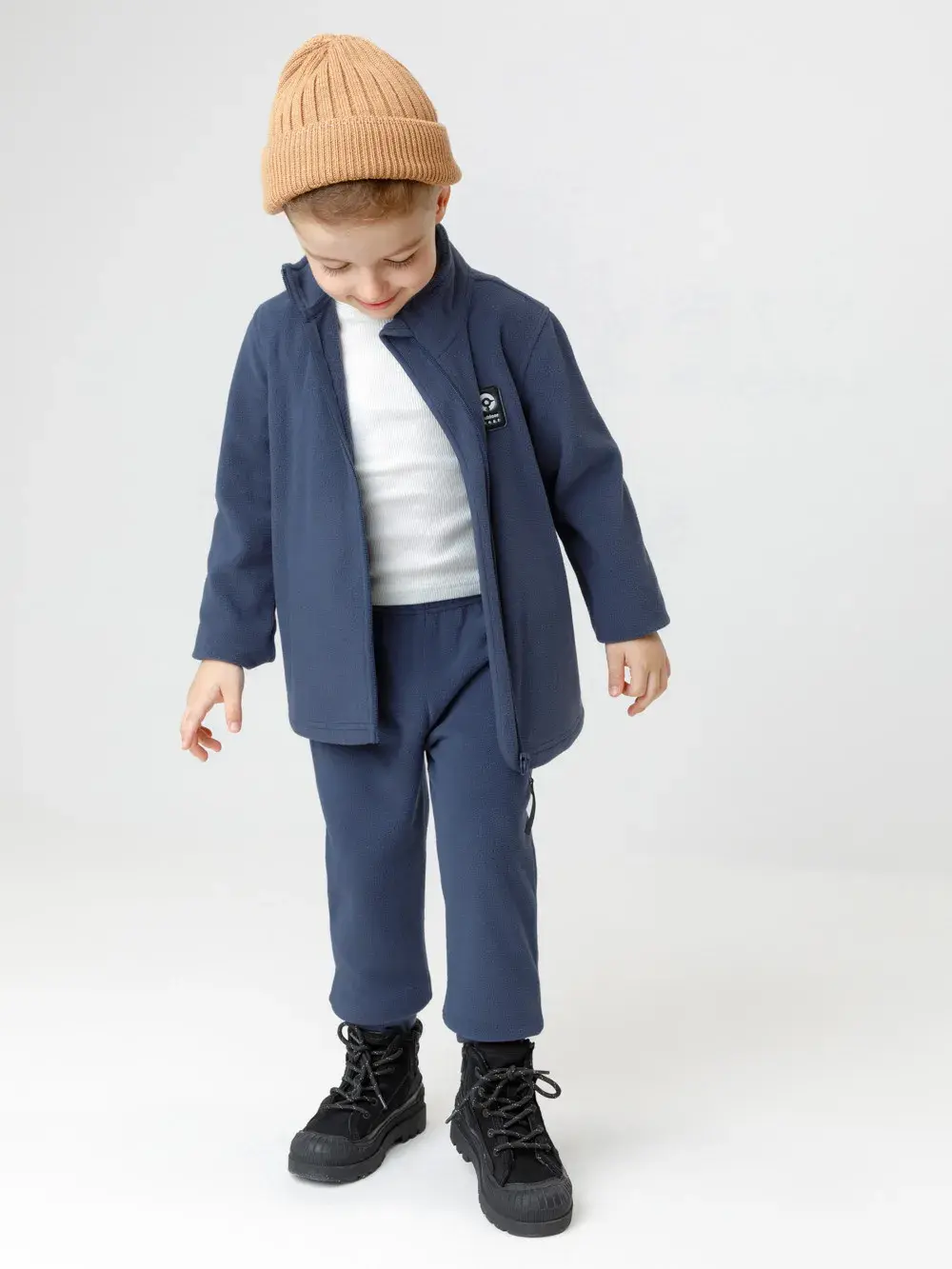 Однотонные детские брюки из флиса с поясом на резинке. Низ изделия на манжетах из эластичного трикотажа в рубчик. Брюки сохраняют цвет и форму после многократных стирок.