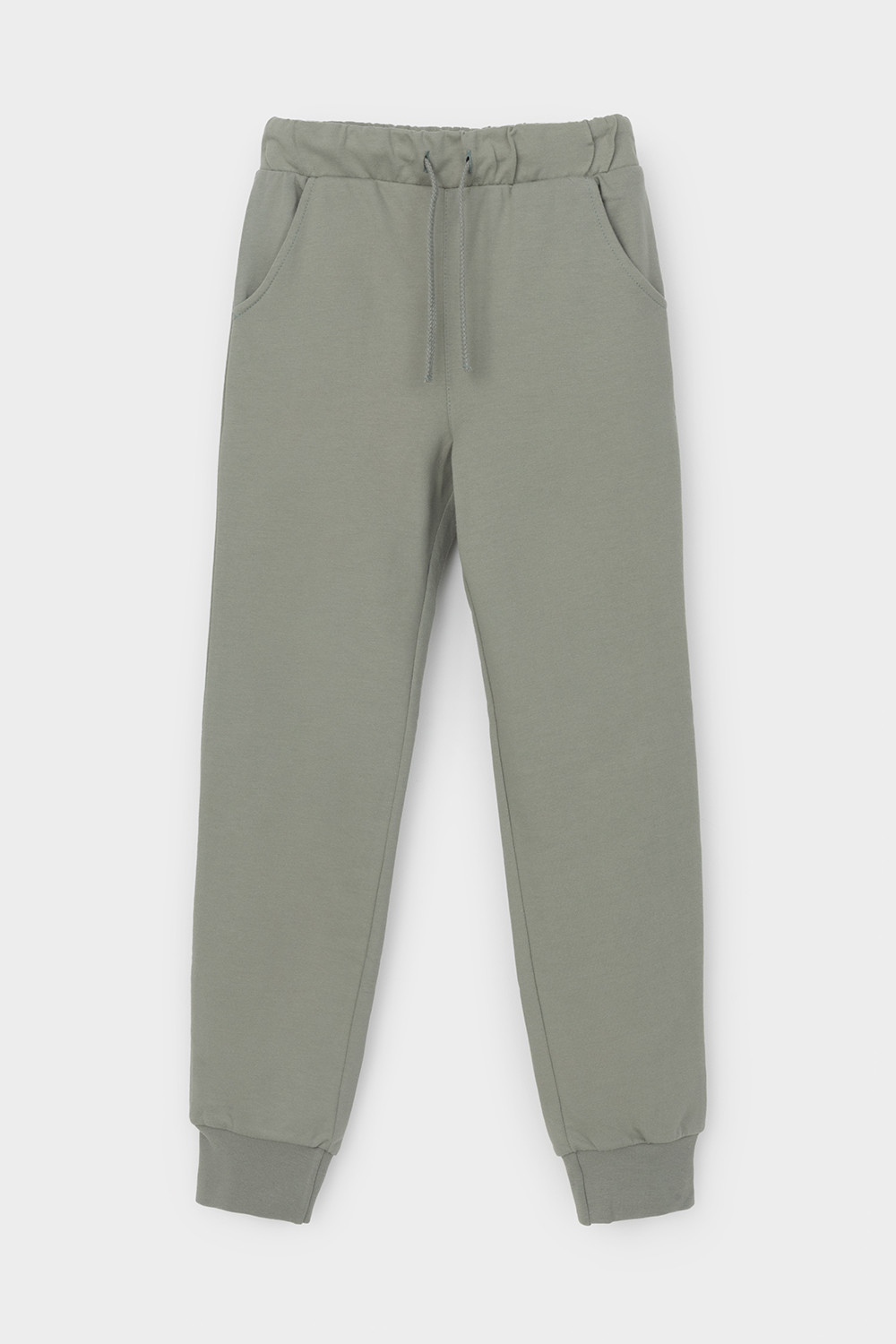 Трикотажные брюки для мальчика из петельчатого футера. Эластичный пояс на резинке регулируется по ширине с помощью шнурка, по бокам два удобных кармана, внизу эластичные манжеты.