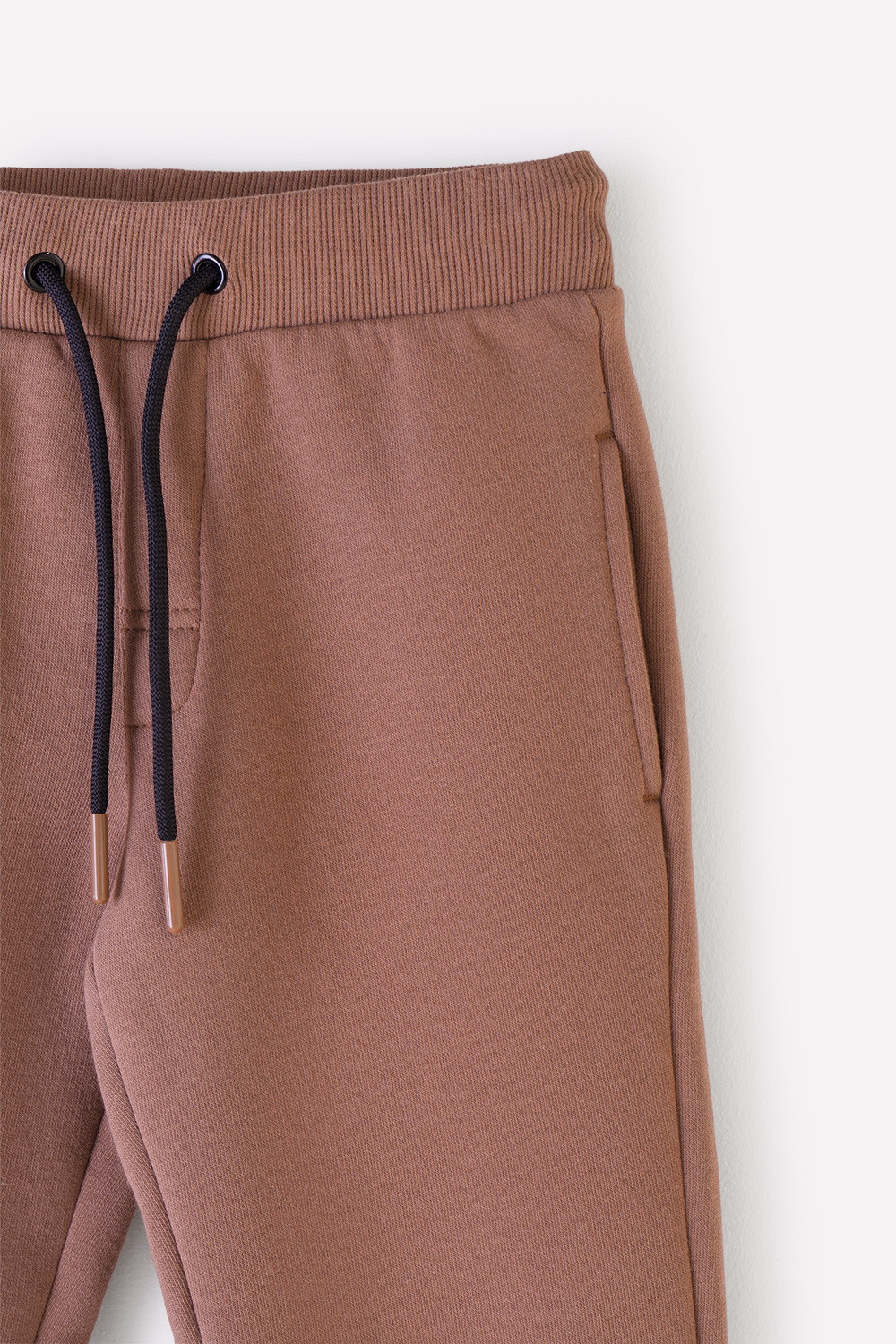 Однотонные брюки для мальчика из футера трехнитки с начесом. Эластичный пояс регулируется по ширине с помощью шнурка. У изделия эластичные манжеты и два кармана по бокам. Брюки сохраняют цвет и форму после многократных стирок.