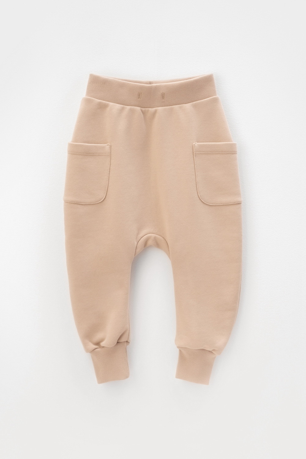 Трикотажные брюки для мальчика из футера с начёсом. В составе 80% натурального хлопка и 20% полиэстера, при этом полиэстер ввязан внутрь по особой технологии и не соприкасается с кожей. Эластичный пояс на резинке регулируется по ширине с помощью шнурка, по бокам два удобных накладных кармана, внизу эластичные манжеты.
