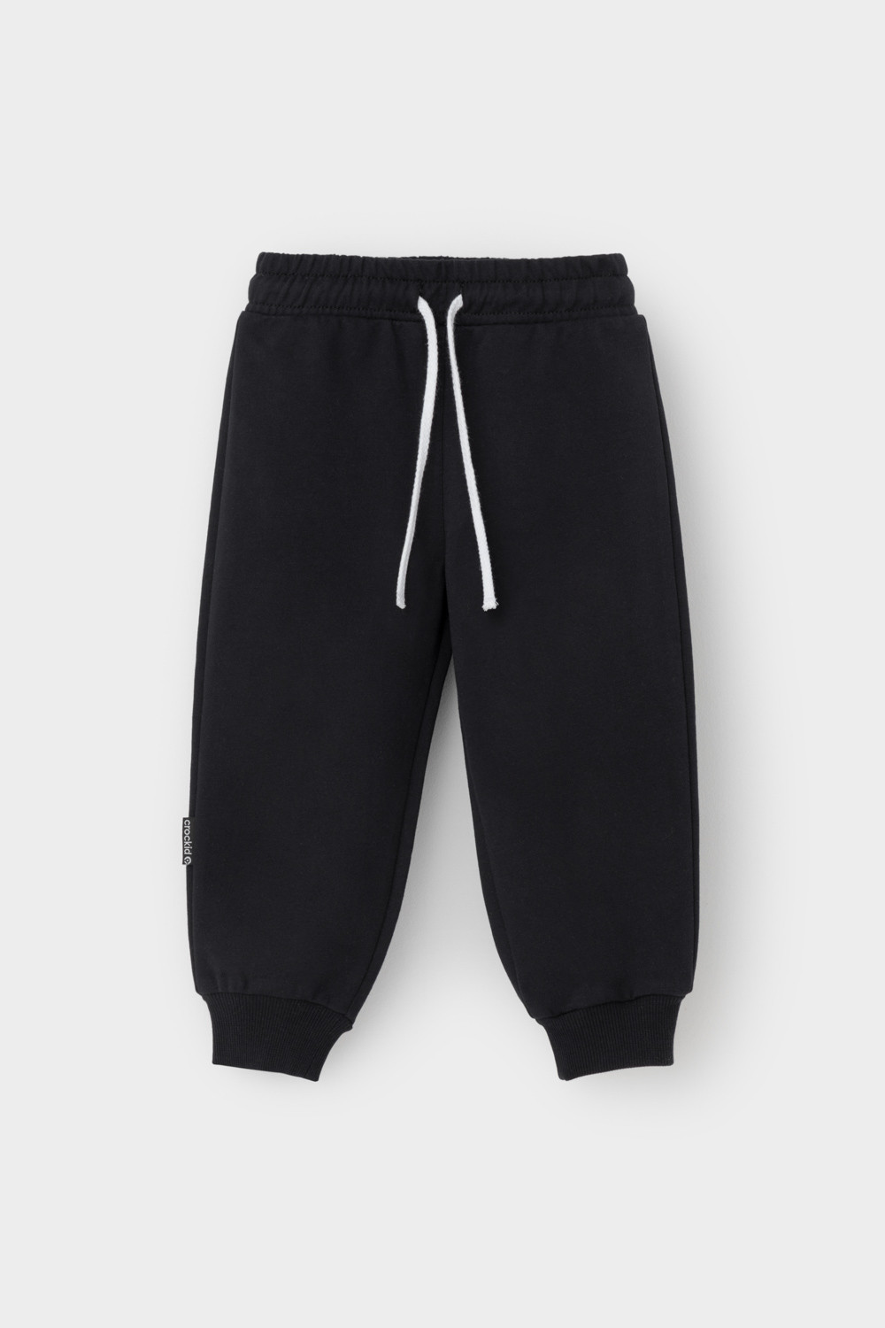 Свободные брюки для мальчика из петельчатого футера. Эластичный пояс на резинке регулируется по ширине с помощью шнурка, внизу эластичные манжеты.