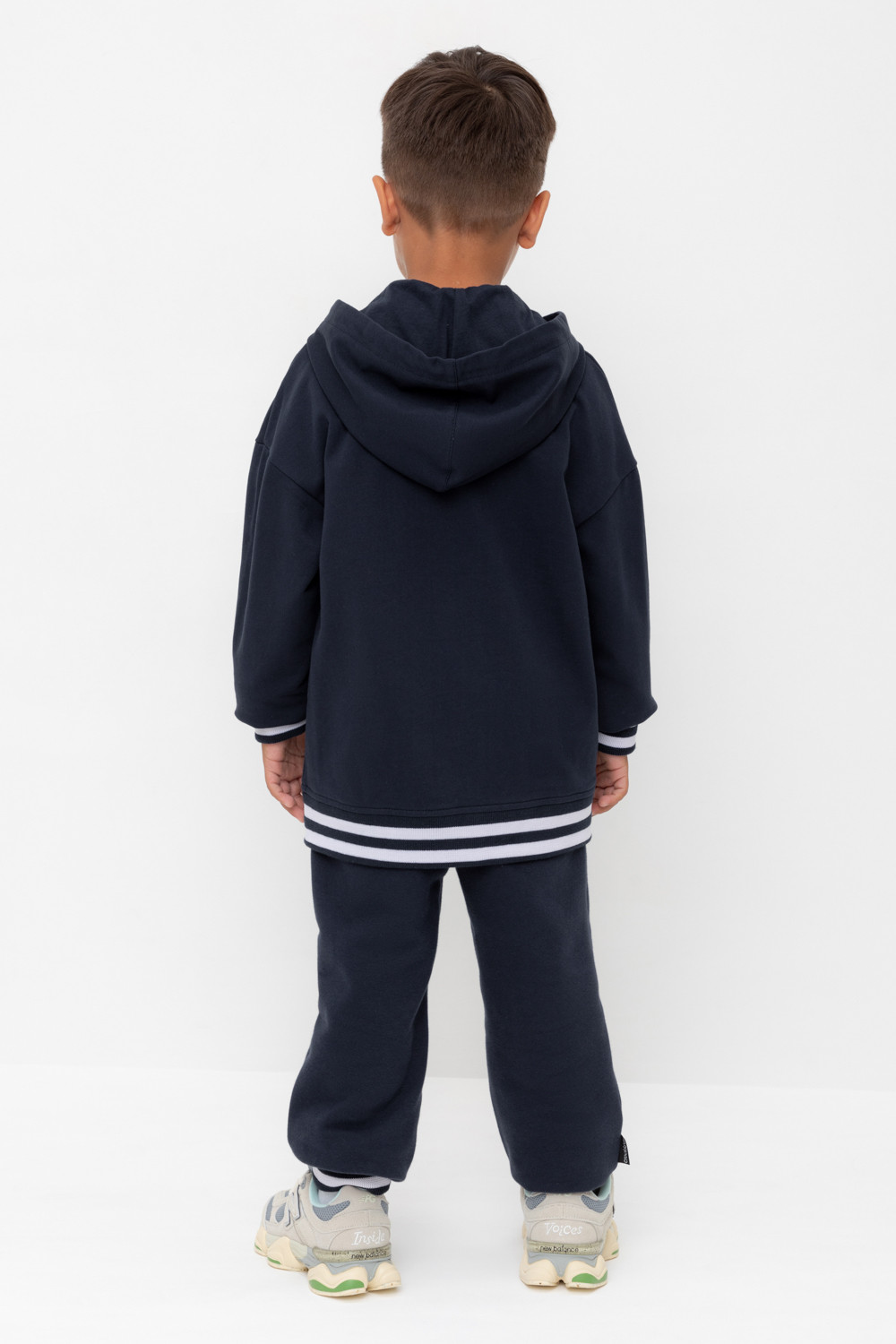 Объёмные брюки для мальчика из мягкого петельчатого трикотажа. В составе 80% натурального хлопка и 20% полиэстера, при этом полиэстер ввязан внутрь по особой технологии и не соприкасается с кожей. Эластичный пояс на резинке регулируется по ширине с помощью шнурка, по бокам два удобных кармана, внизу эластичные манжеты.