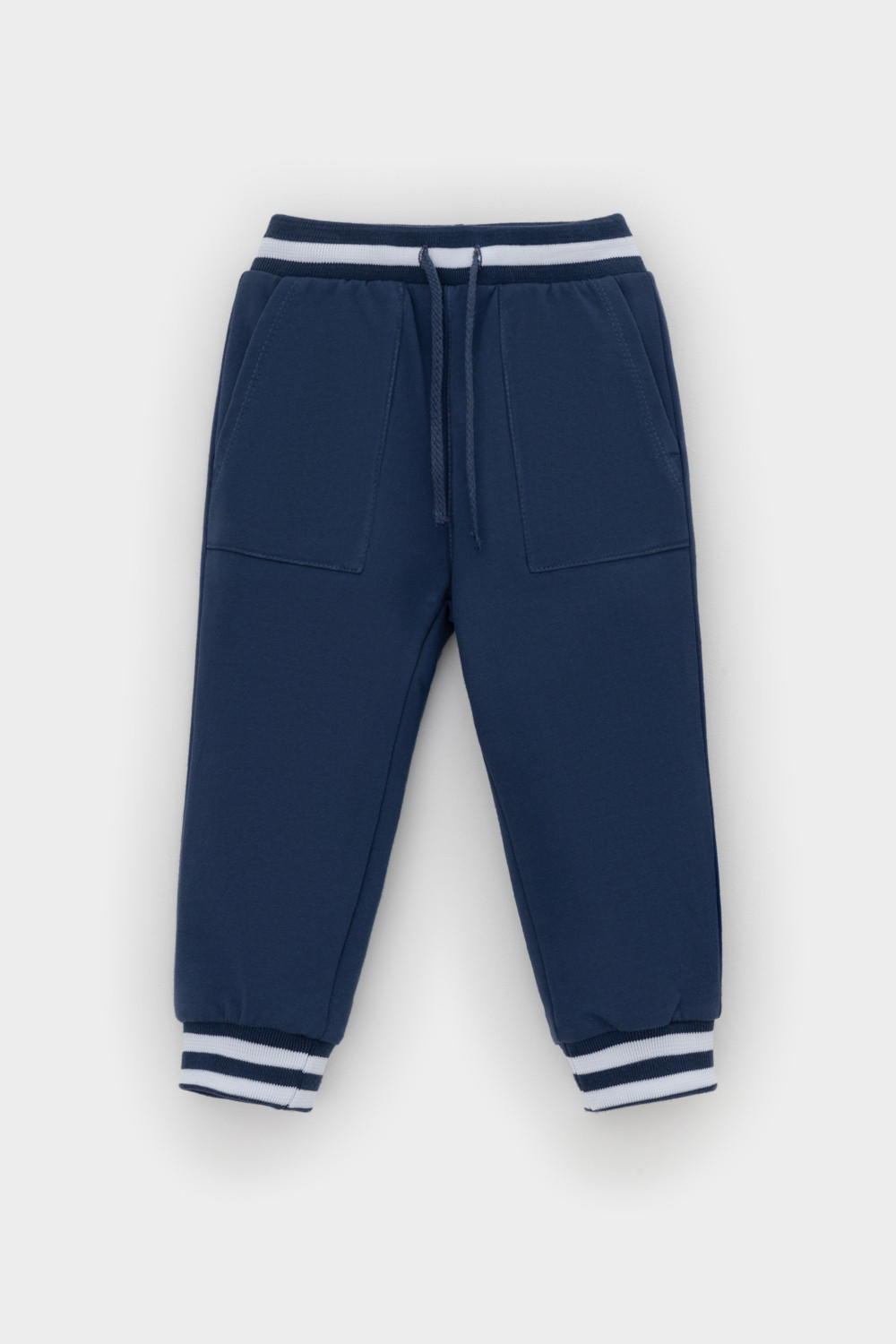 Брюки для мальчика из высококачественного трикотажного полотна. Пояс на резинке регулируется по ширине с помощью шнурка. По бокам два удобных кармана. Внизу эластичные манжеты.
