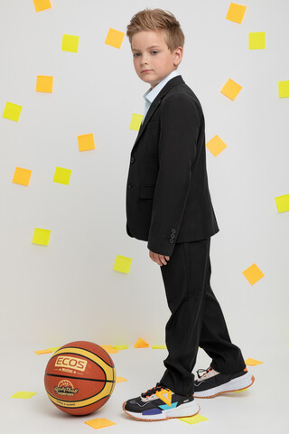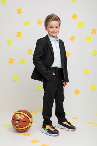 Классические школьные брюки со стрелками для мальчика. Застёгиваются на пуговицу, регулируются по ширине с помощью утяжки на резинку и пуговицы. По бокам и на спинке удобные карманы. По низу брюки обработаны оверлоком.