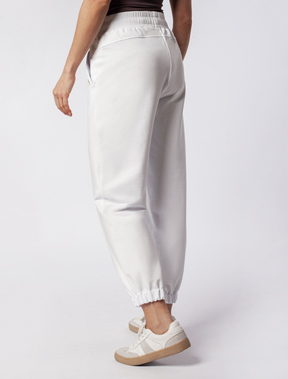 Брюки выполнены из эластичного футера двухнитки. Изделие дополнено боковыми карманами с фирменным логотипом бренда. Пояс на резинке регулируется потайным хлопковым шнурком. Эластан в составе гарантирует комфорт и формоустойчивость. Модель сочетается в костюме с свитшотом D49.072 и паркой D49.076