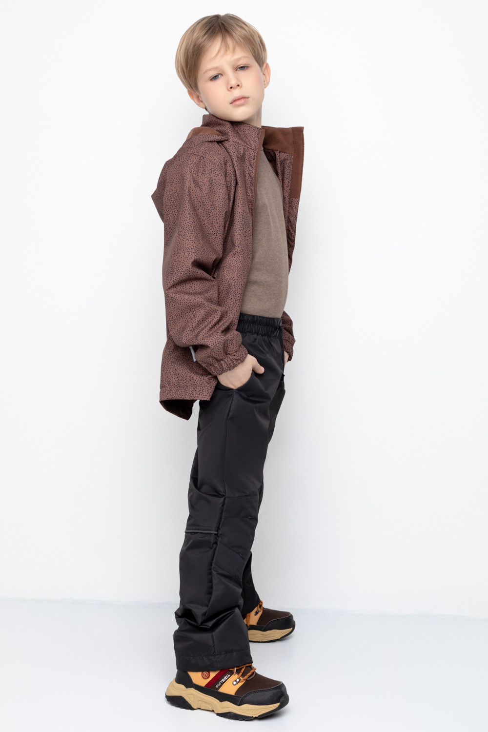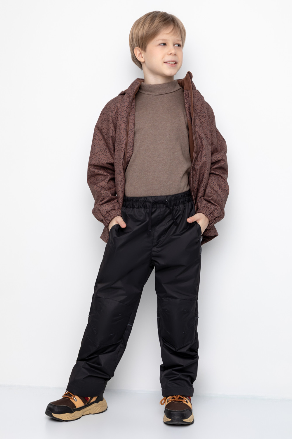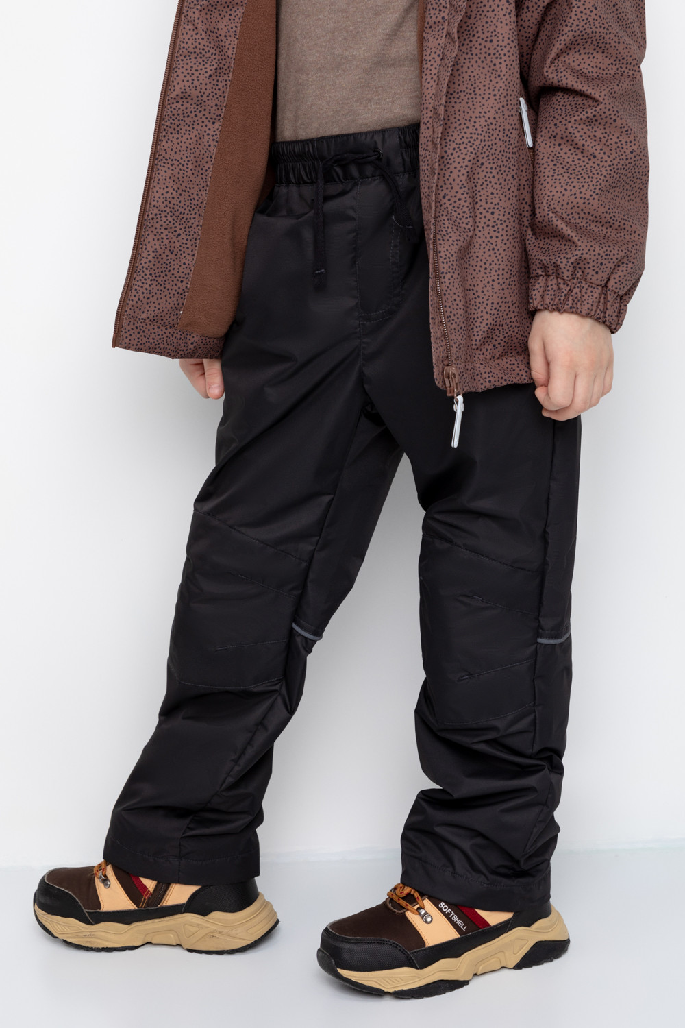 Ветровочные брюки из мембранной, фактурной ткани с дополнительной тефлоновой обработкой. Данный вид обработки предохраняет изделие от загрязнения и лучше отводит влагу. Подклад из 100% полиэстера - флиса. Область коленей дополнительно усилена деталями из основной ткани. В поясе предусмотрен шнурок для регулировки ширины изделия. Во всех изделиях верхнего ассортимента для безопасности ребенка предусмотрены светоотражающие элементы.