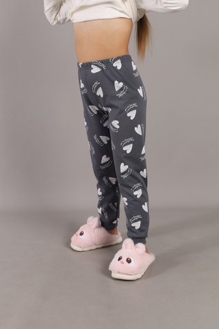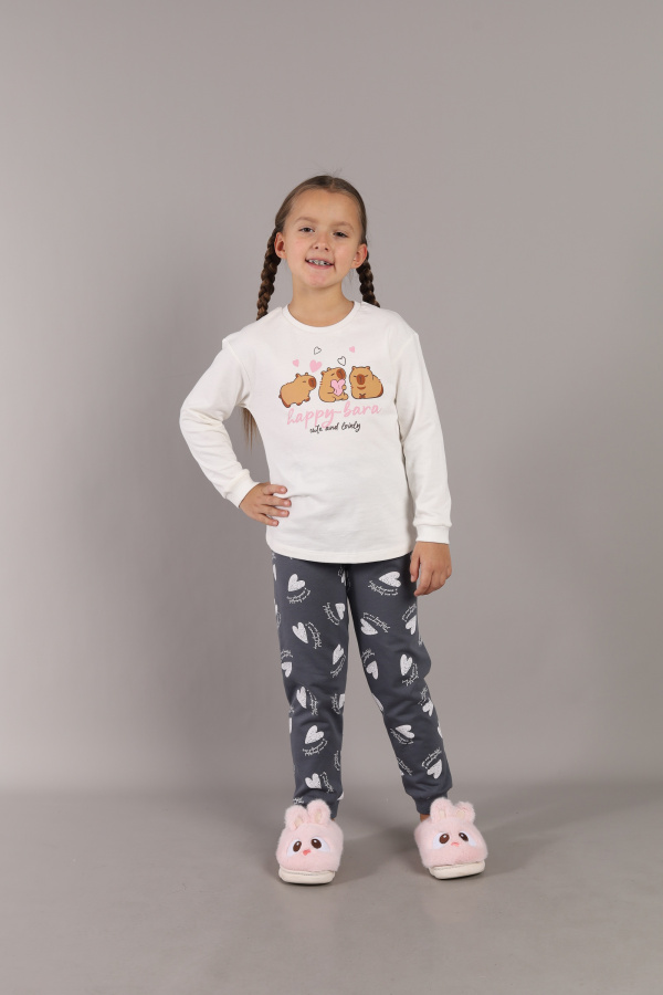 Пижама для девочки: джемпер и брюки из мягкого трикотажа. Джемпер с длинным рукавом на манжете из кашкорсе. Горловина круглая, из кашкорсе.На полочке выполнена шелкография в виде трех капибар и надпись - милый и прелестный. Брюки с поясом на резинке и манжетами по низу из кашкорсе. Полотно с набивкой из сердечек.