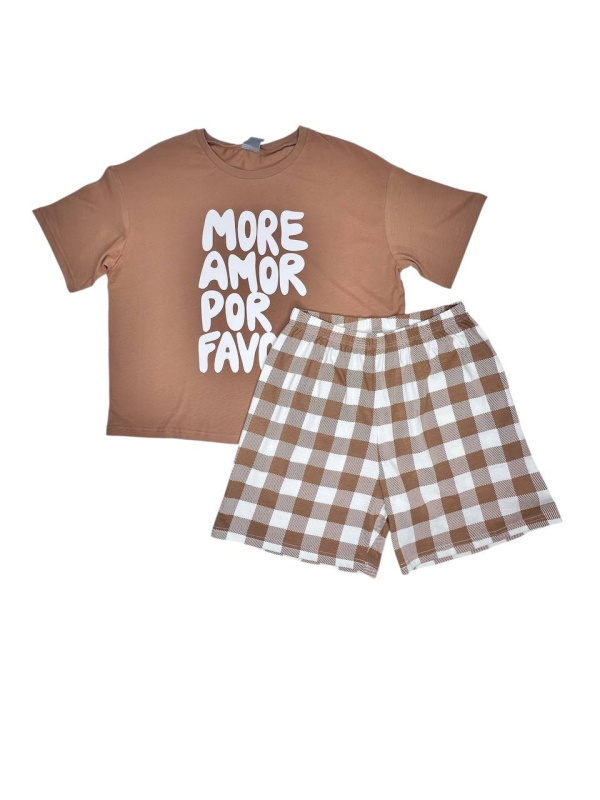 Пижама женская: футболка и шорты из мягкого трикотажа. Футболка с кортким рукавом. Горловина круглая, из рибаны.На полочке выполнена шелкография в виде котика. Шорты с поясом на резинке. Полотно с набивкой из котиков.