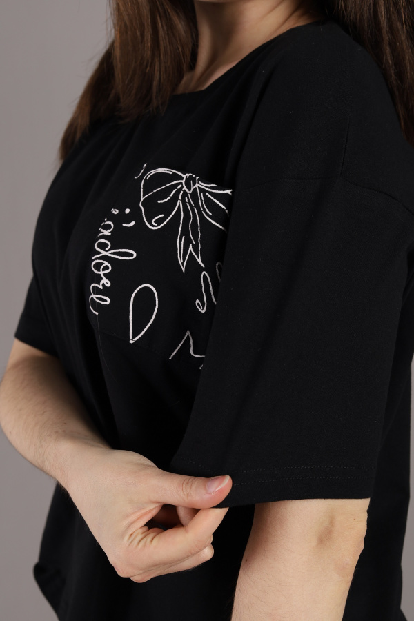 Пижама женская: футболка и брюки из мягкого трикотажа. Футболка с кортким рукавом. Горловина круглая, из рибаны.На полочке нагрудный карман из полотна с набивкой. Брюки с поясом на резинке. Полотно с набивкой из бантиков и надписей.
