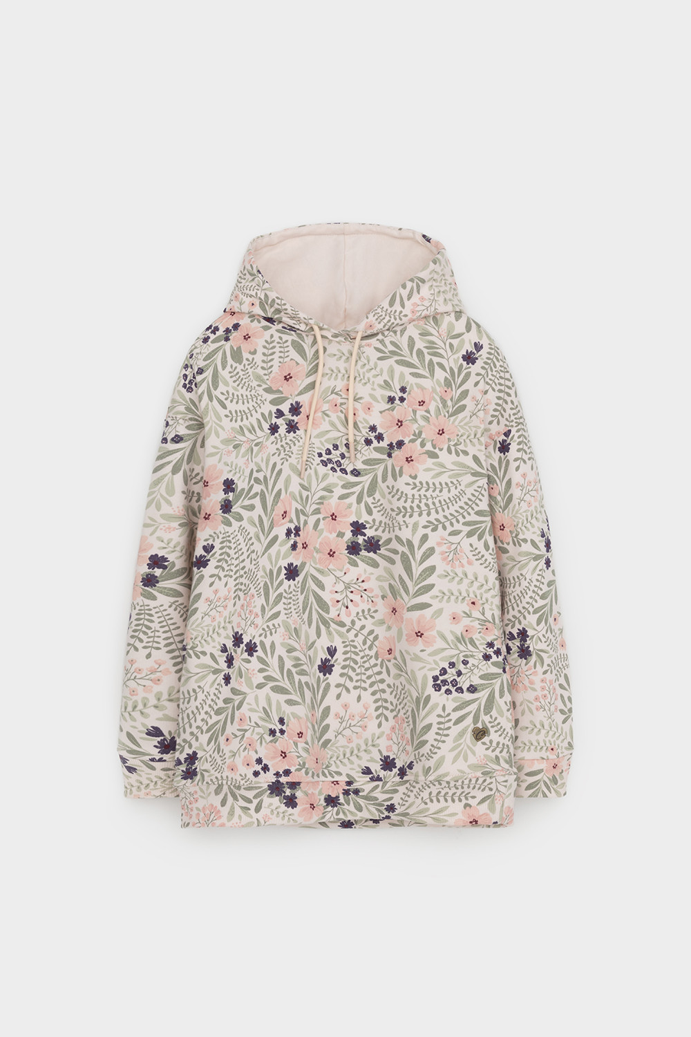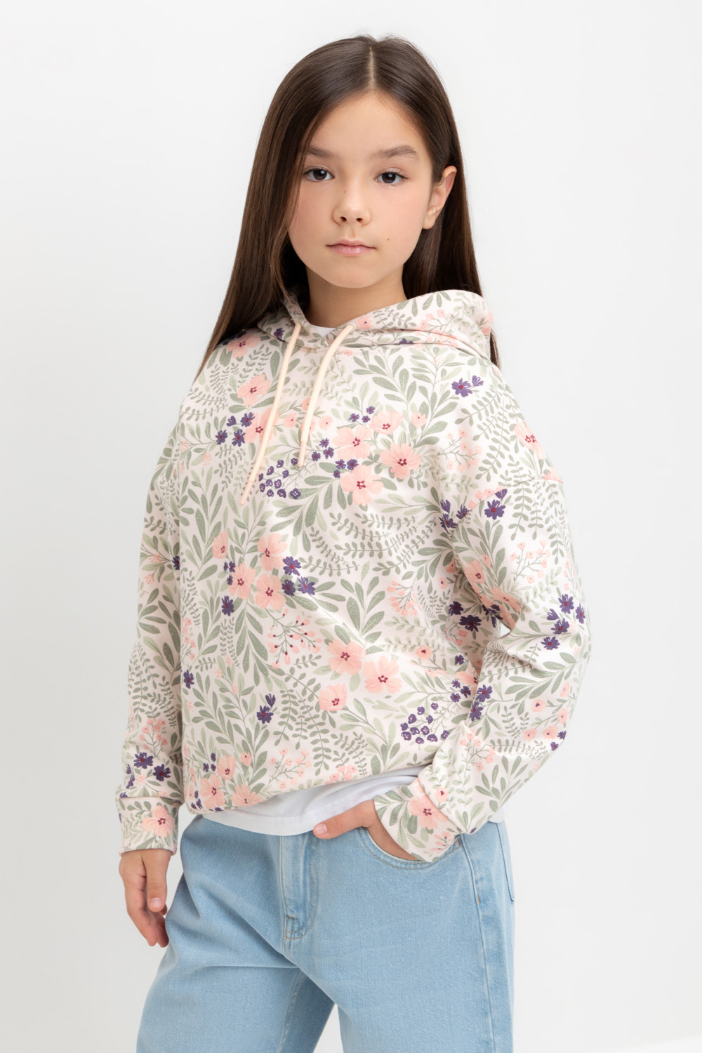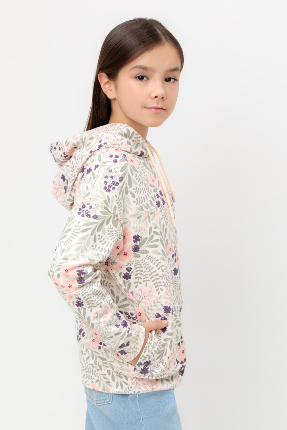 Толстовка с капюшоном для девочки из мягкого петельчатого футера. Оригинальная набивка выполнена из стойких текстильных гипоаллергенных красителей. Манжеты и пояс из эластичного трикотажа.