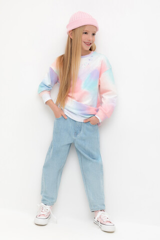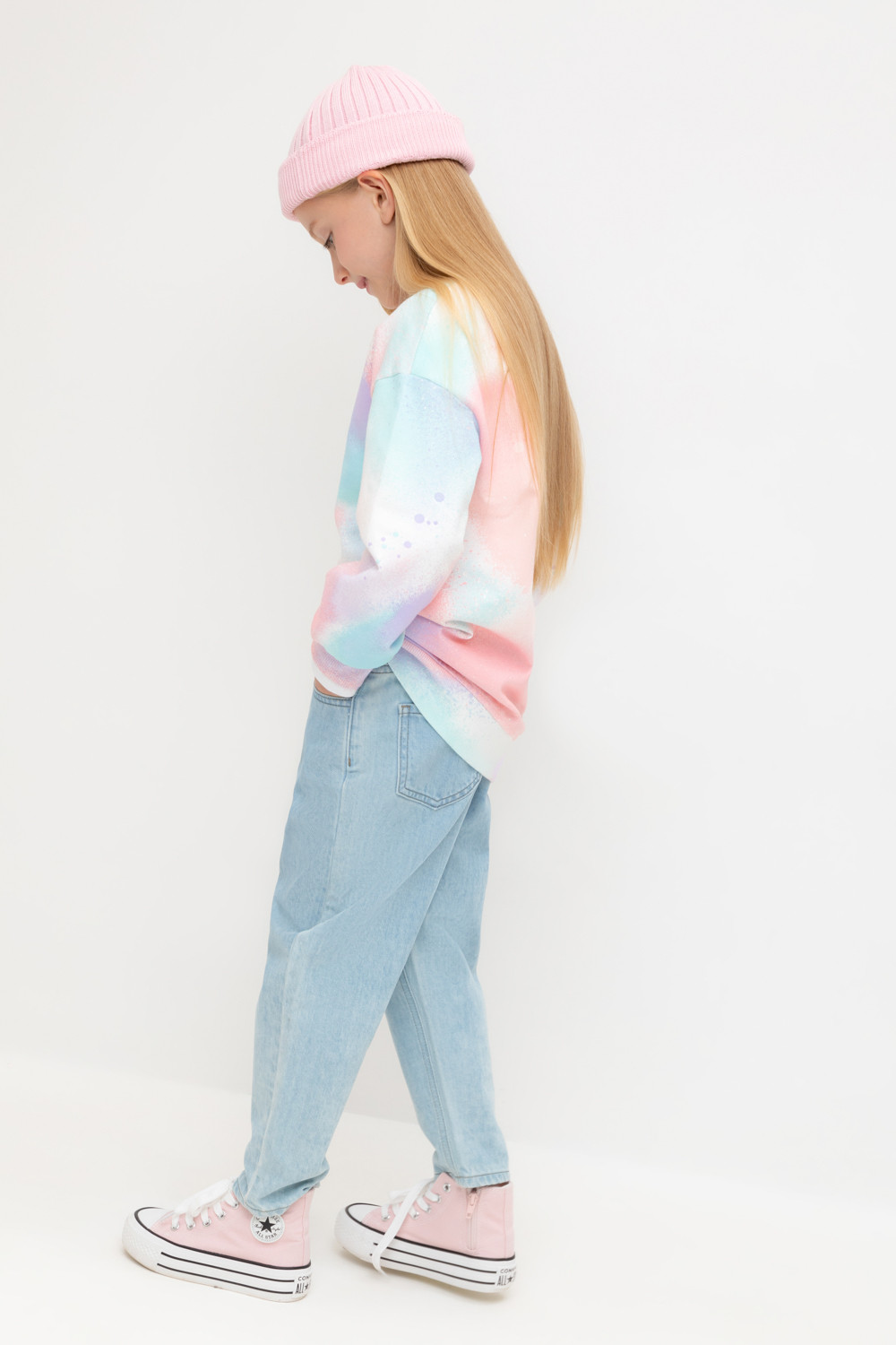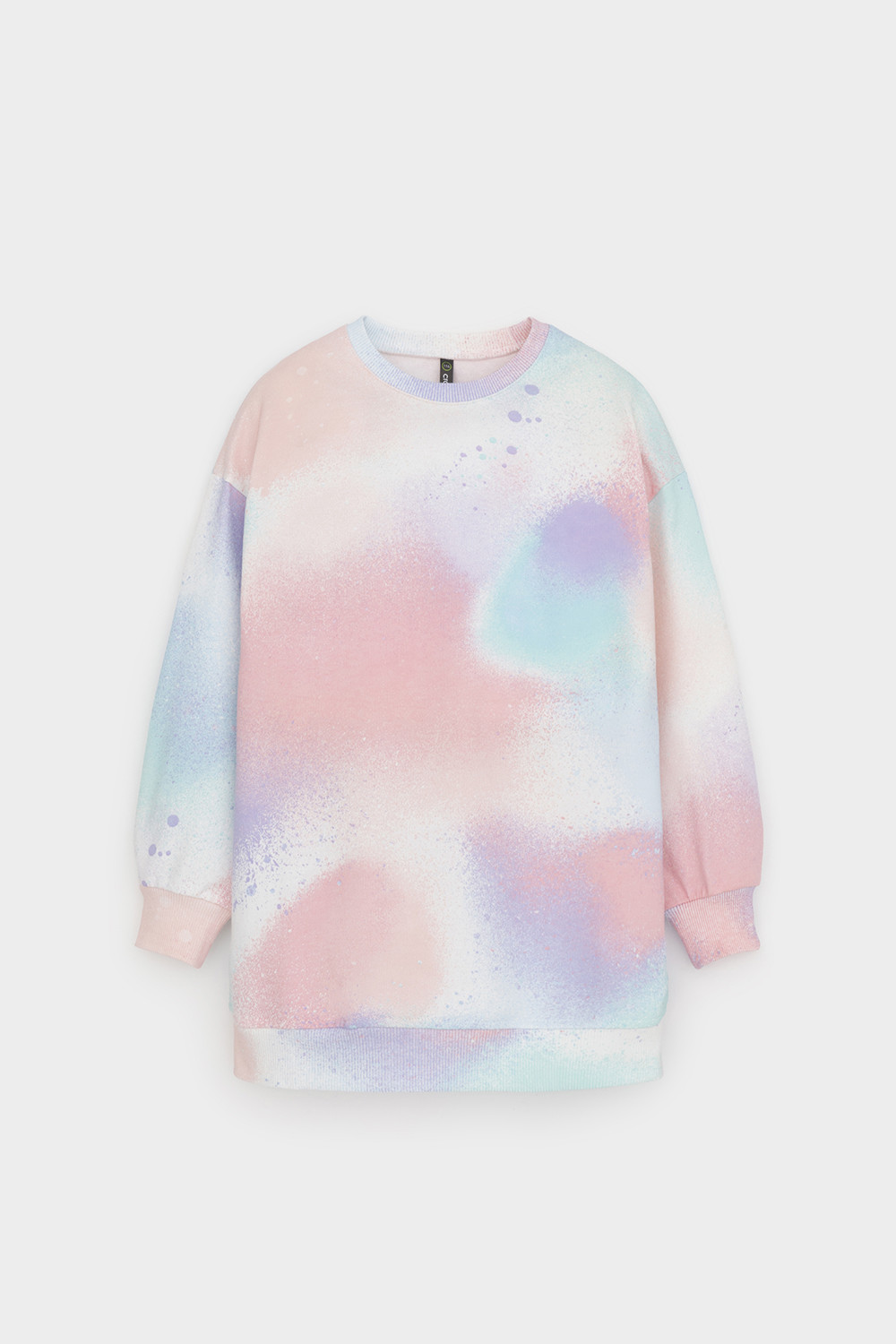 Удлинённый джемпер из петельчатого футера. Спущенные плечи и сборки по низу на рукавах придают свободный объём. Оригинальная набивка выполнена из стойких текстильных гипоаллергенных красителей.