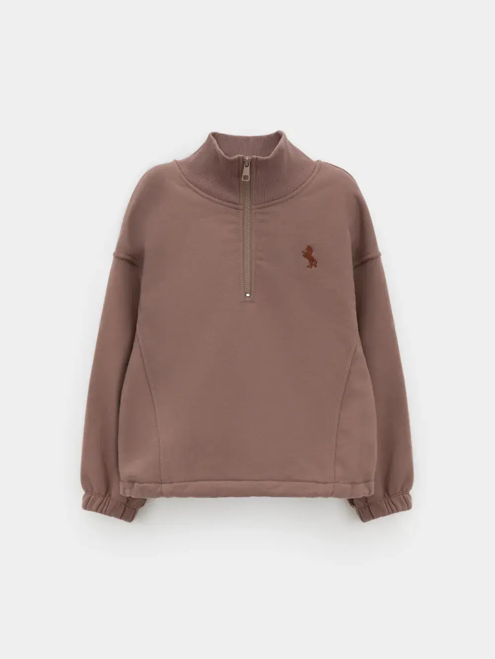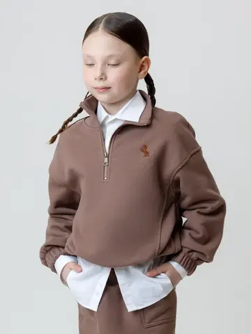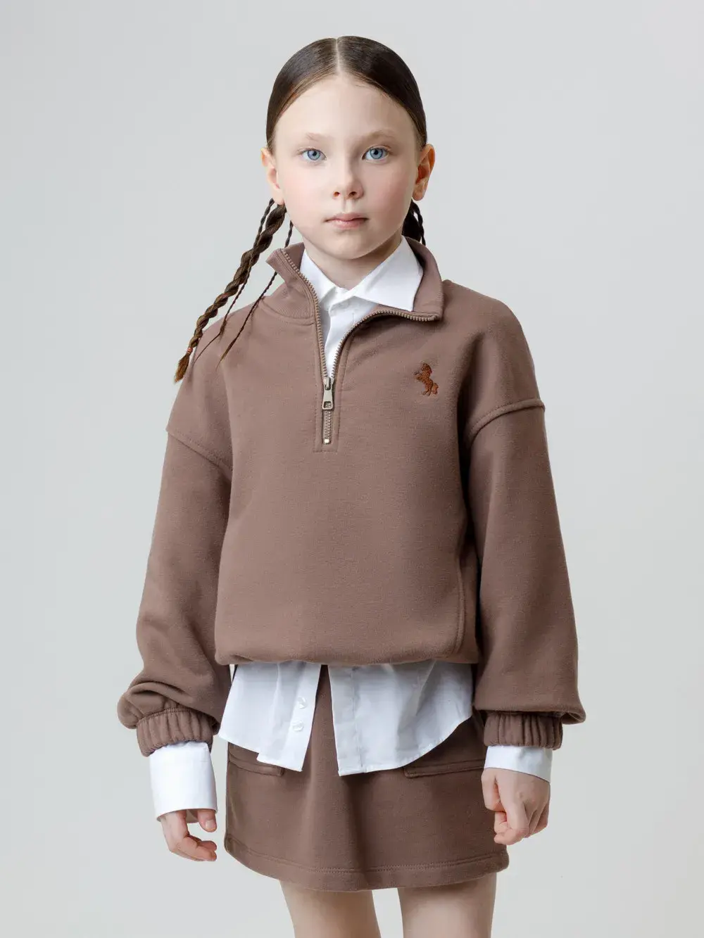 Мягкий свитшот с вышивкой для девочки. Изготовлен из высококачественного футера петли трёхнитки. Спереди застёгивается на короткую металлическую молнию. Воротник выполнен из эластичного полотна в рубчик. Рукава со спущенными плечами и низ изделия собраны на резинку. Свитшот сохраняет форму и стойкий цвет после многочисленных стирок и идеально подходит на каждый день. Все трикотажные полотна производятся в соответствии с нормами швейцарского сертификата ЭкоТекс.
