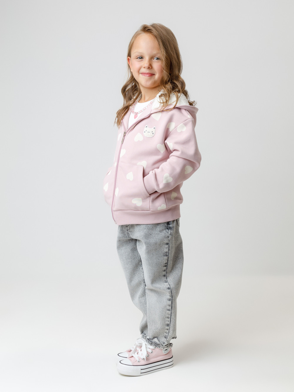 Толстовка для девочки со спущенными плечами. Изготовлена из высококачественного петельчатого футера трёхнитки. Застёгивается на молнию. В капюшоне мягкий подклад из флиса с длинным ворсом. Манжеты и пояс выполнены из эластичного полотна. Спереди удобный вместительный карман-кенгуру. Изделие сохраняет цвет и форму после многократных стирок. Все трикотажные полотна производятся в соответствии с нормами швейцарского сертификата ЭкоТекс.