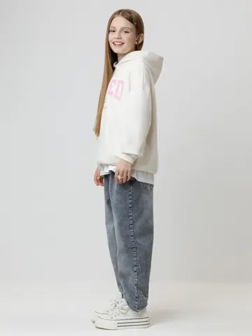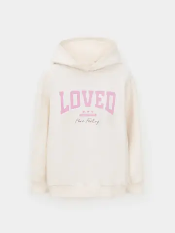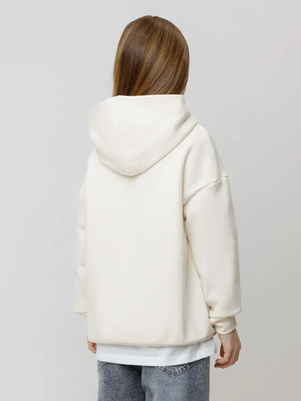Худи с капюшоном для девочки из тёплого футера с начёсом. В составе 80% натурального хлопка и 20% полиэстера, при этом полиэстер ввязан внутрь по особой технологии и не соприкасается с кожей. Модель оверсайз. Пояс и манжеты выполнены из мягкого эластичного трикотажа. Худи сохраняет форму и стойкий цвет после многочисленных стирок и идеально подходит на каждый день. Оригинальный принт выполнен из стойких текстильных гипоаллергенных красителей. Все трикотажные полотна производятся в соответствии с нормами швейцарского сертификата ЭкоТекс.