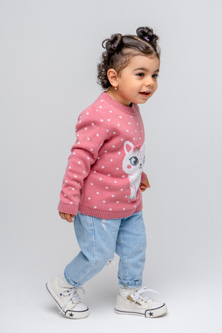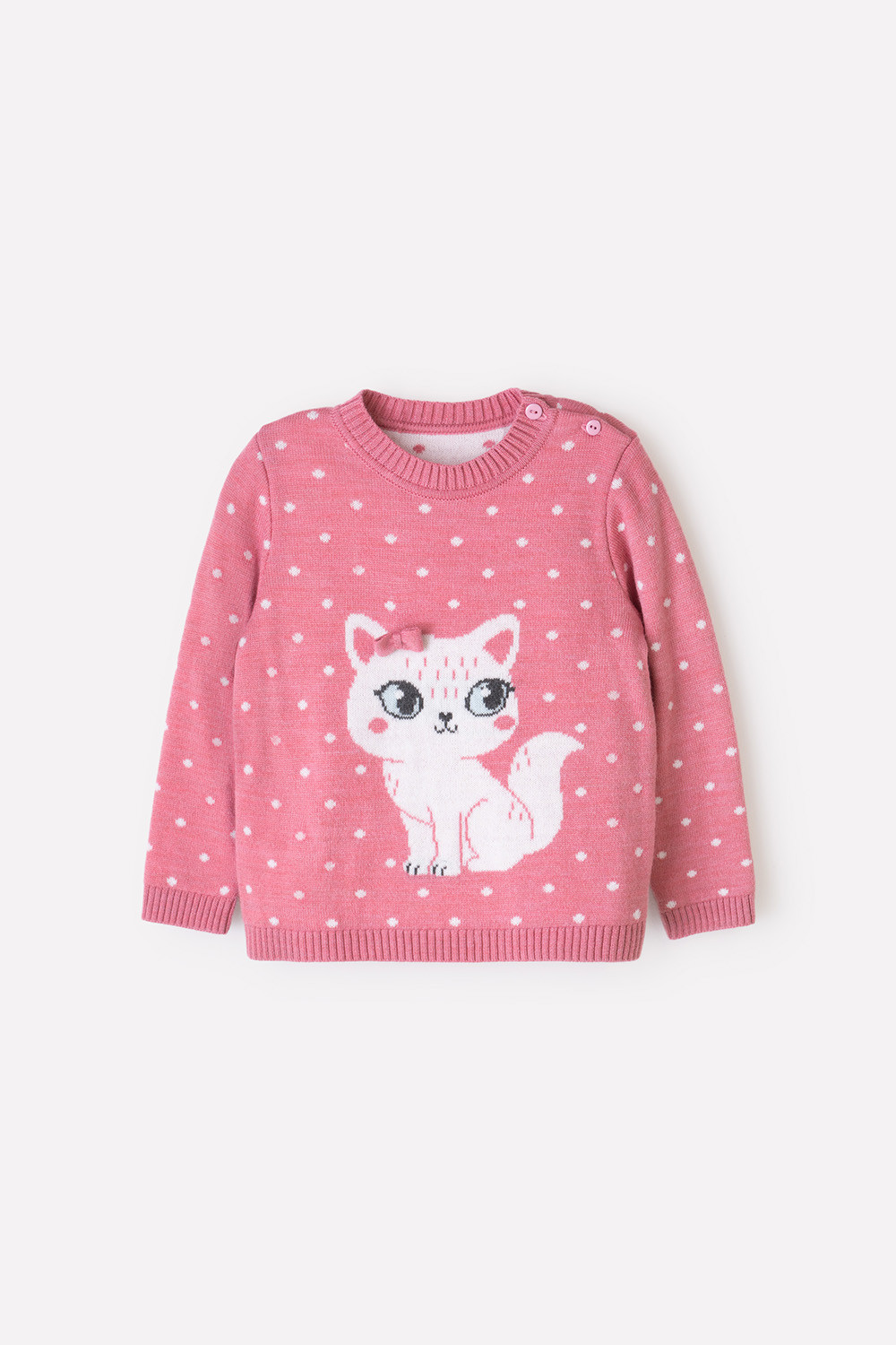 Вязанный джемпер из полушерстяной пряжи в состав которой входит шерсть австралийского мериноса. Горловина, манжеты и низ изделия связаны ластиком. Для удобства изделие застёгивается на пуговицы на плече.