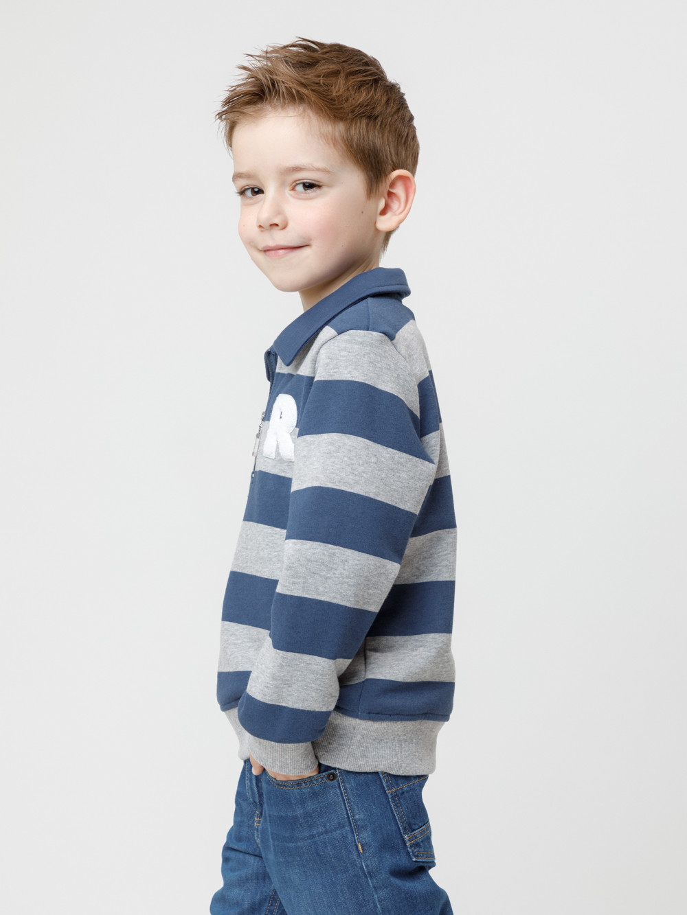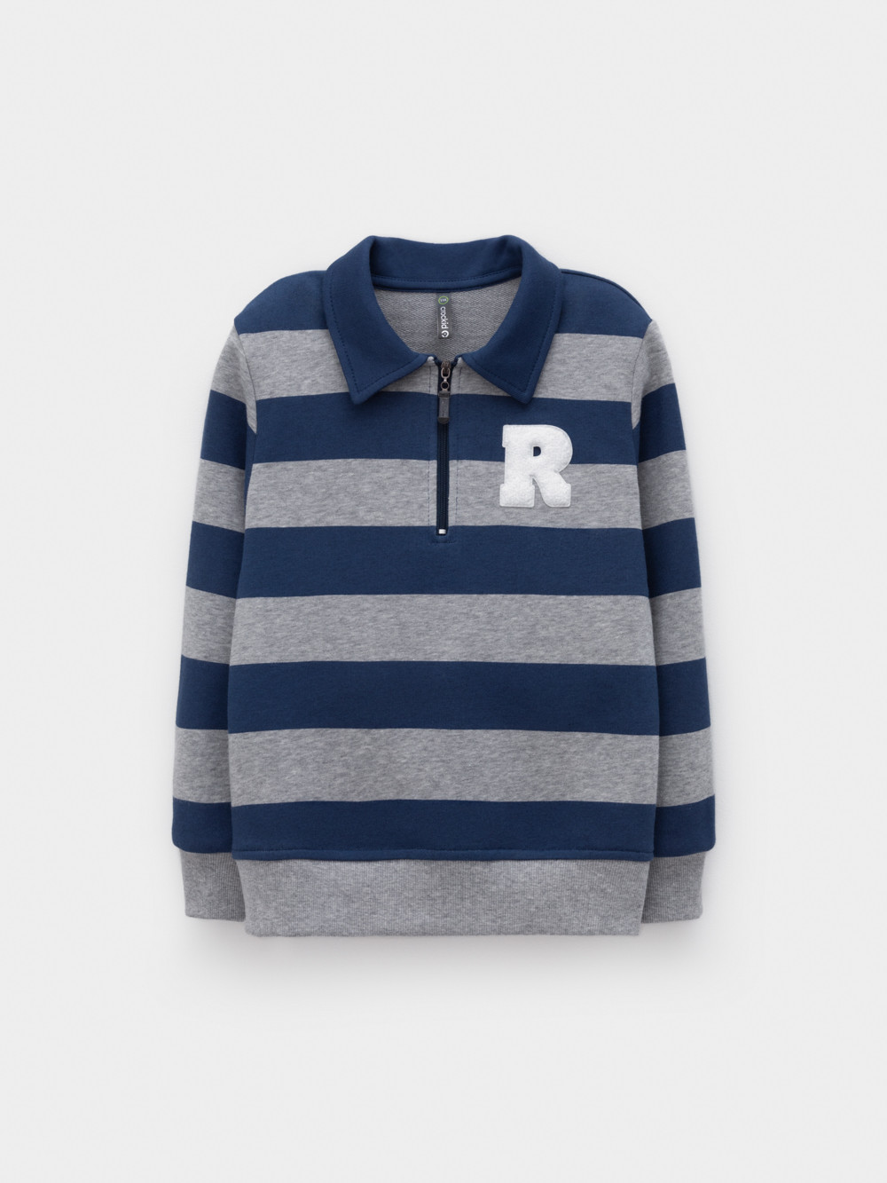 Свитшот с воротником для мальчика. Изготовлен из высококачественного петельчатого футера. В составе 80% натурального хлопка и 20% полиэстера, при этом полиэстер ввязан внутрь по особой технологии и не соприкасается с кожей. Манжеты и пояс выполнены из эластичного полотна. На груди короткая застёжка на молнию. Оригинальный рисунок выполнен из стойких текстильных гипоаллергенных красителей. Изделие сохраняет цвет и форму после многократных стирок.
