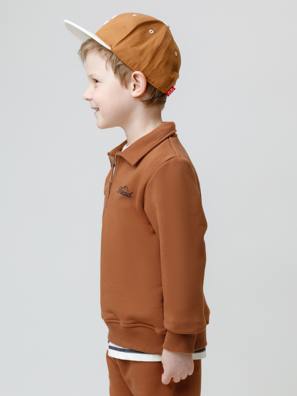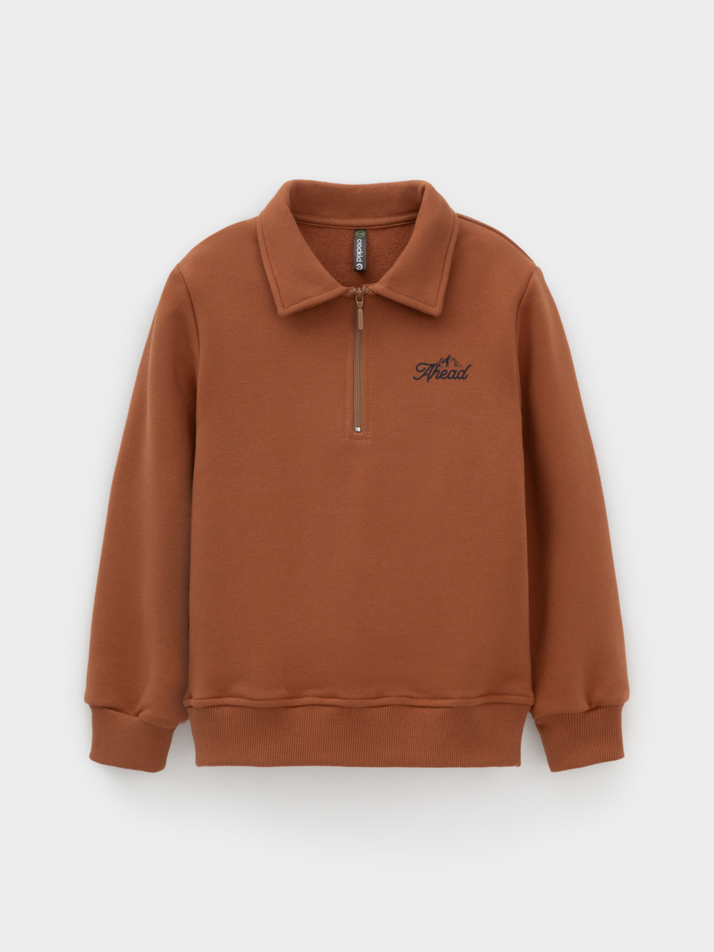 Свитшот с воротником для мальчика. Изготовлен из высококачественного петельчатого футера. В составе 80% натурального хлопка и 20% полиэстера, при этом полиэстер ввязан внутрь по особой технологии и не соприкасается с кожей. Манжеты и пояс выполнены из эластичного полотна. На груди короткая застёжка на молнию. Оригинальный принт выполнен из стойких текстильных гипоаллергенных красителей. Изделие сохраняет цвет и форму после многократных стирок.