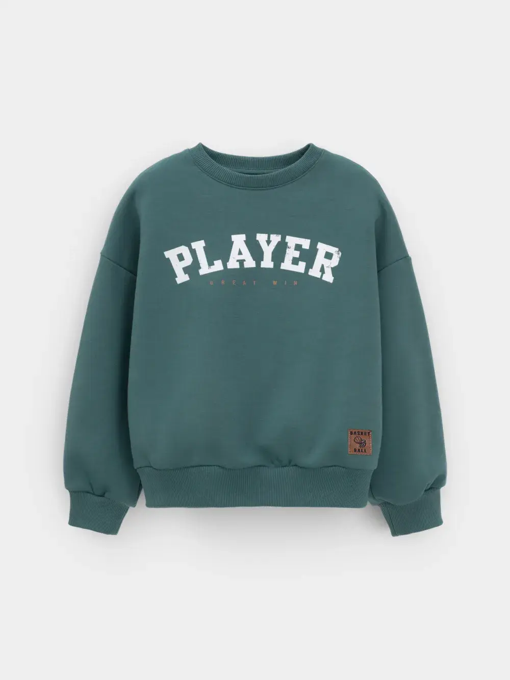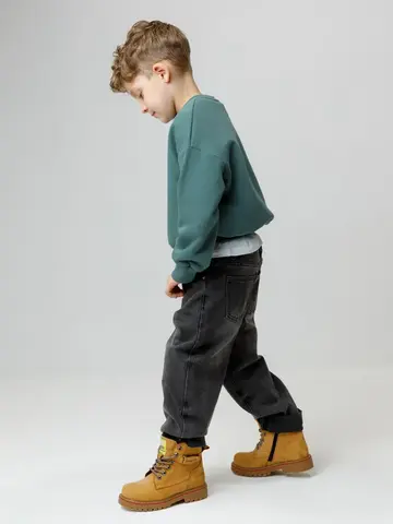 Тёплый свитшот для мальчика из мягкого футера с начёсом. Обтачка горловины, манжеты и пояс выполнены из эластичного полотна. В размерах 92 и 98 на спинке имеется застёжка на кнопки. Оригинальный принт нанесён с помощью стойких текстильных гипоаллергенных красителей.