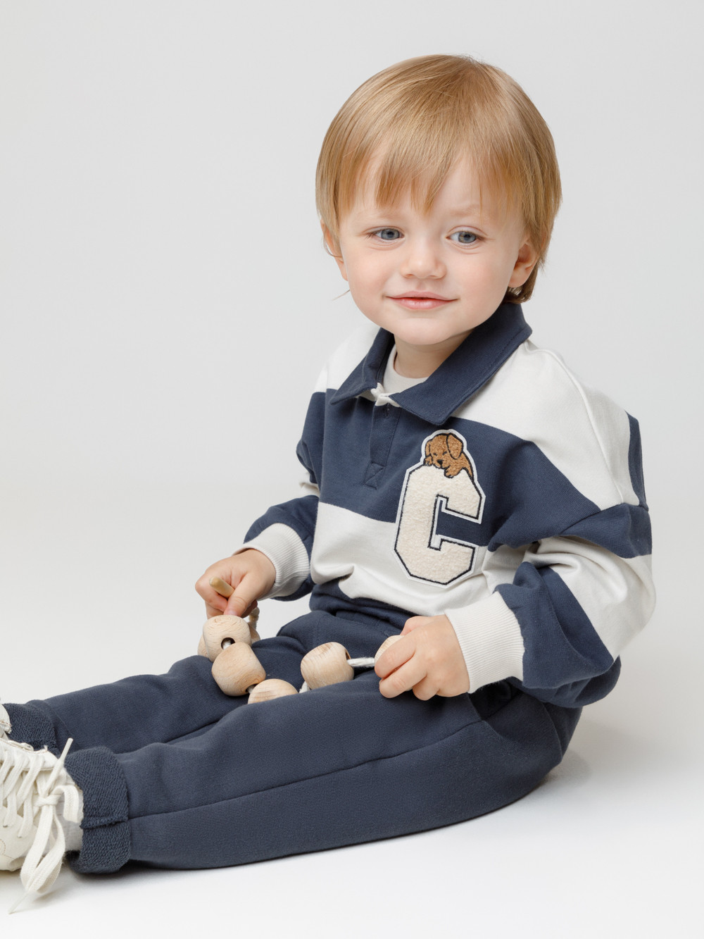 Свитшот с воротником для мальчика. Изготовлен из высококачественного петельчатого футера. Манжеты и пояс выполнены из эластичного полотна. На груди застёжка на пуговицу. Изделие сохраняет цвет и форму после многократных стирок.